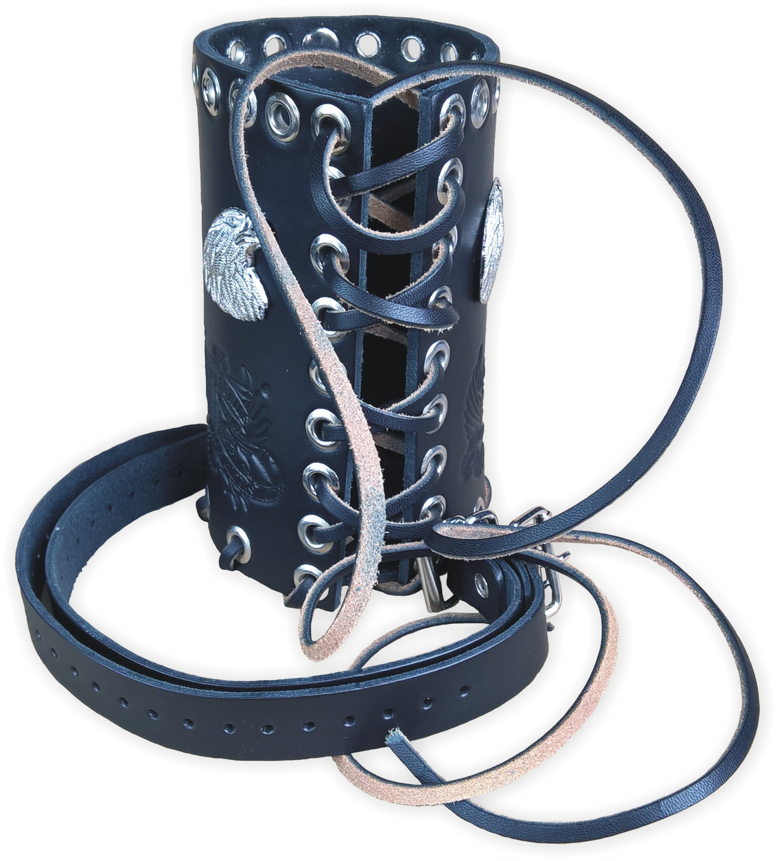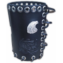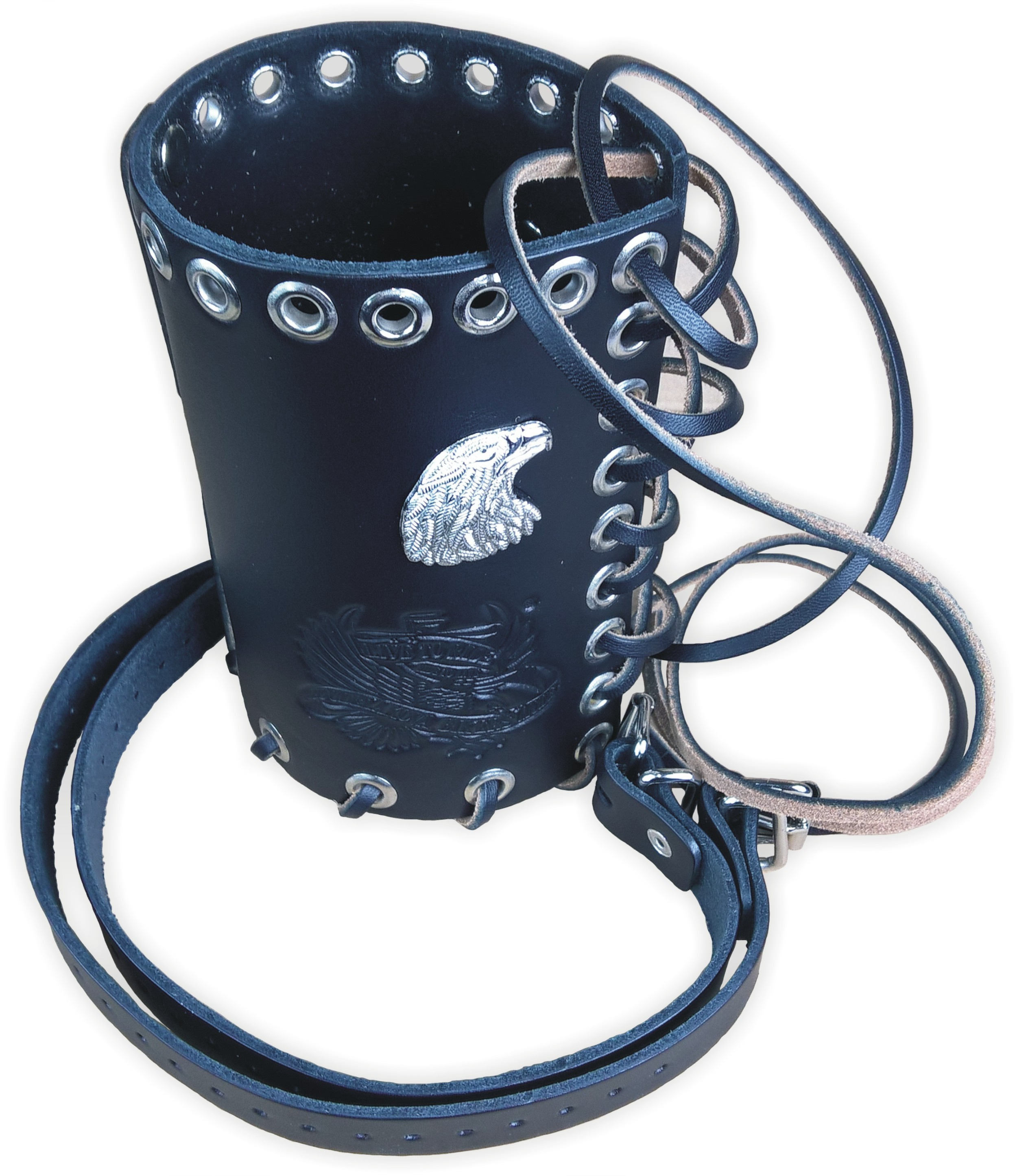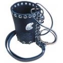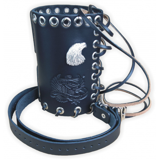 Držák, obal na větší (0,7L, 1L, 1,5L) PET láhev ap. Možno upevnit na řídítka, padací rám, opěrku, přední vidlici ad. pomocí dvou řemínků. Kvalitní kůže a špičkové zpracování.
