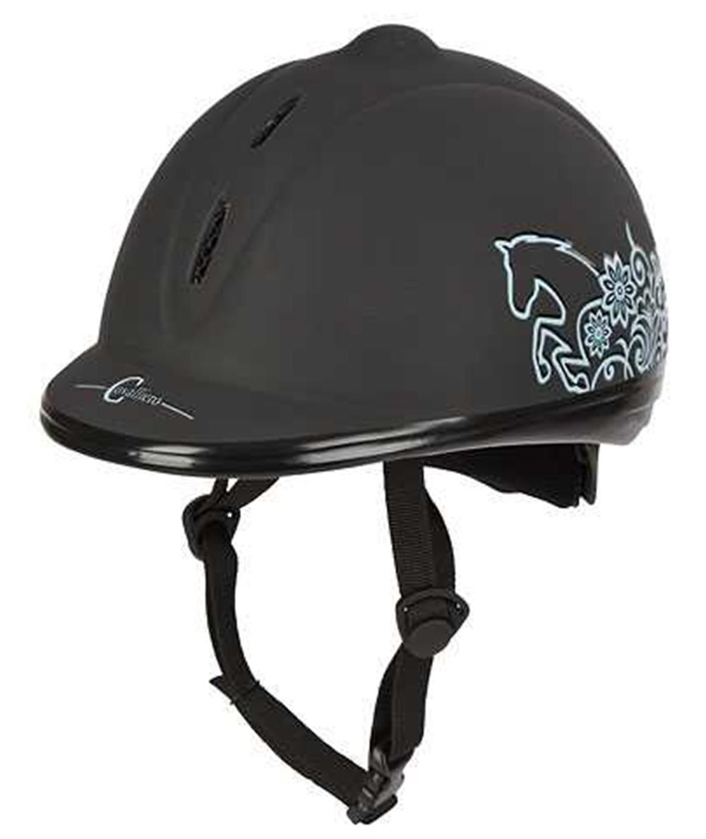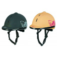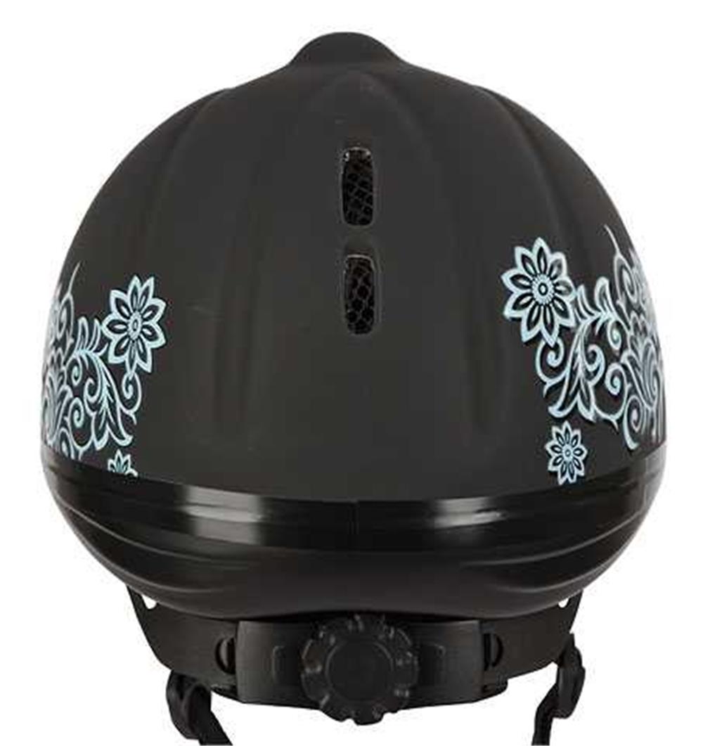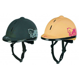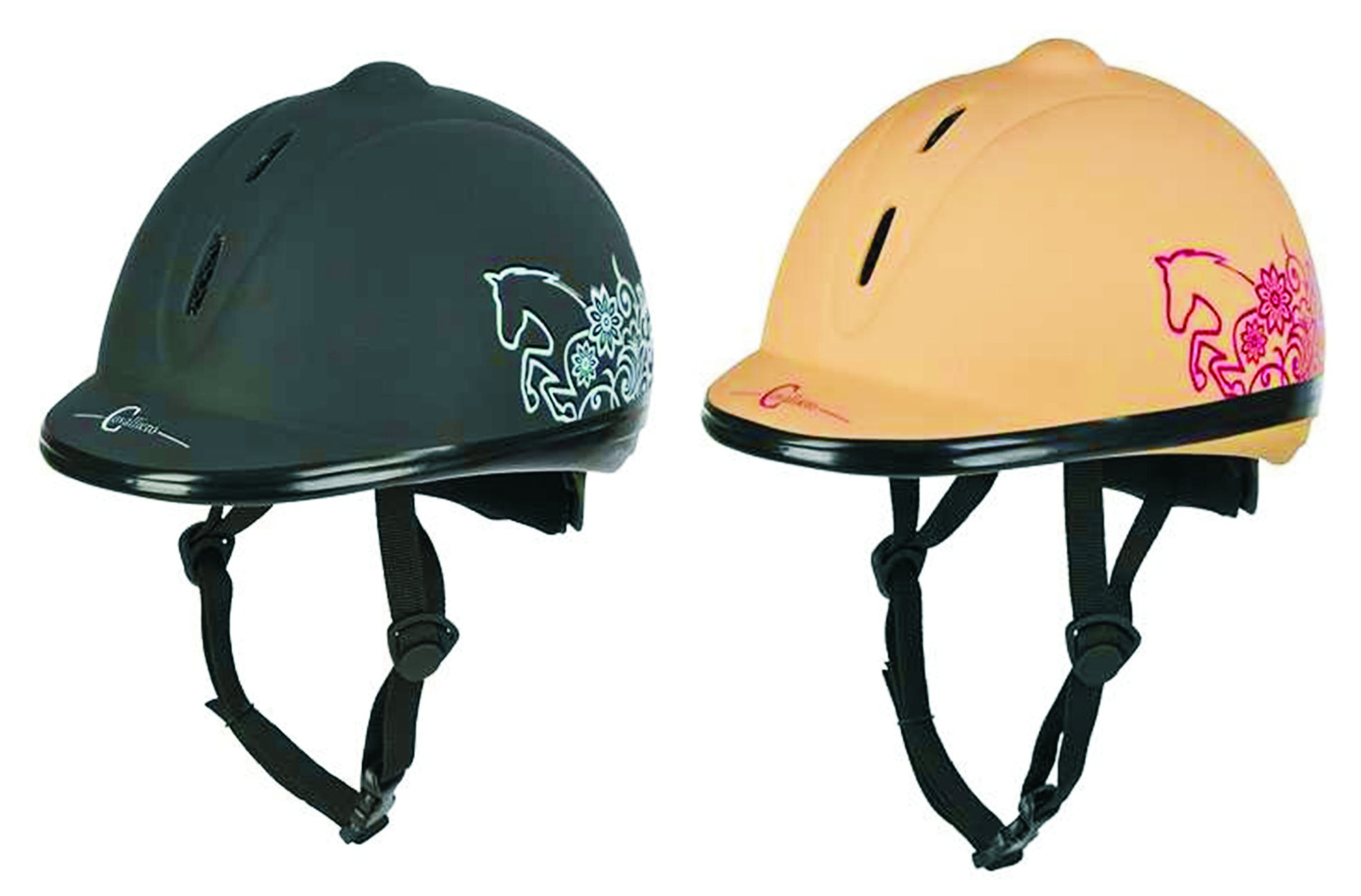 Dětská jezdecká helma Covalliero Beauty VG1 s obrázkem květin a koně.