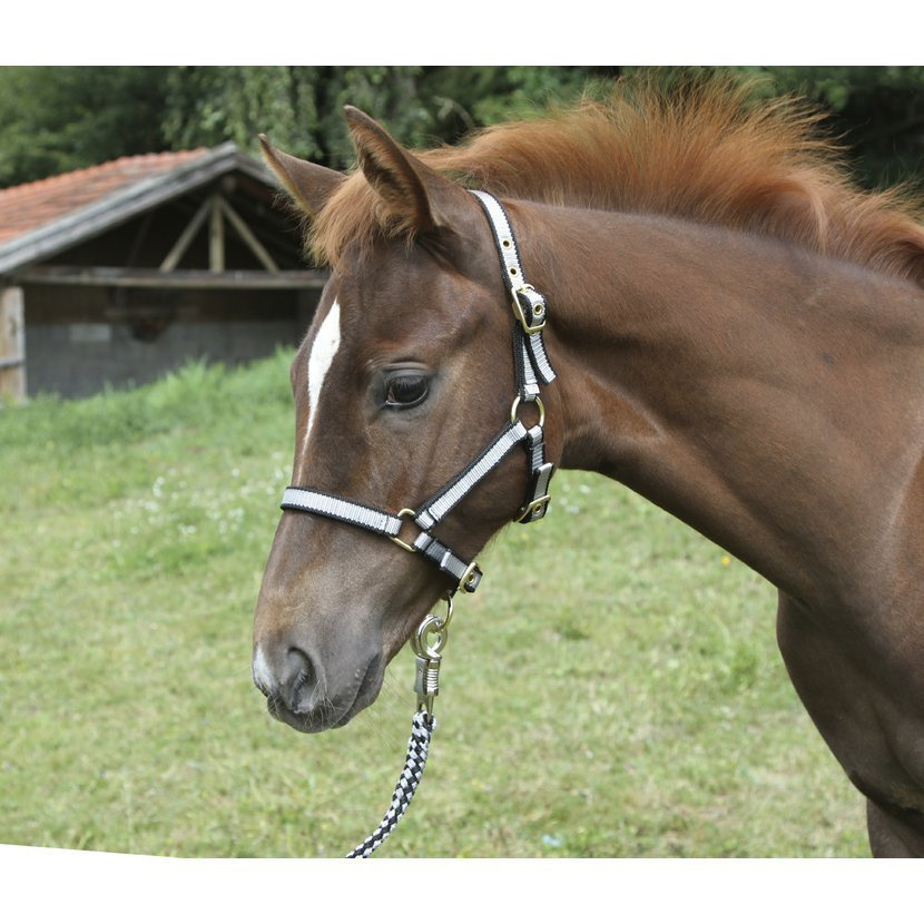 Nylonová hříběcí ohlávka Hippo s plynule nastavitelným nátylníkem, snadné odepínání podhrdelníku pomocí karabiny, nerezové kování.