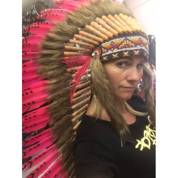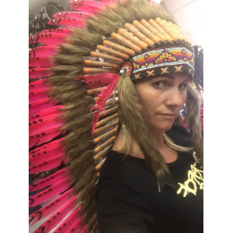 Velká kvalitní indiánská čelenka s 59 pery 25 - 30 cm dlouhými, s ponyovými korálky a dvěma postranními rozetami. Vyrobeno z pravých materiálů a per kohoutů u etnických indiánů.