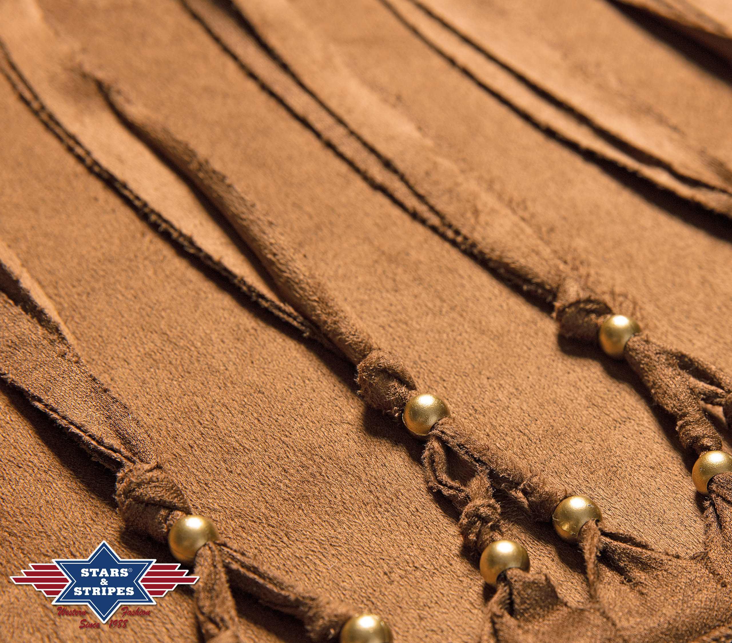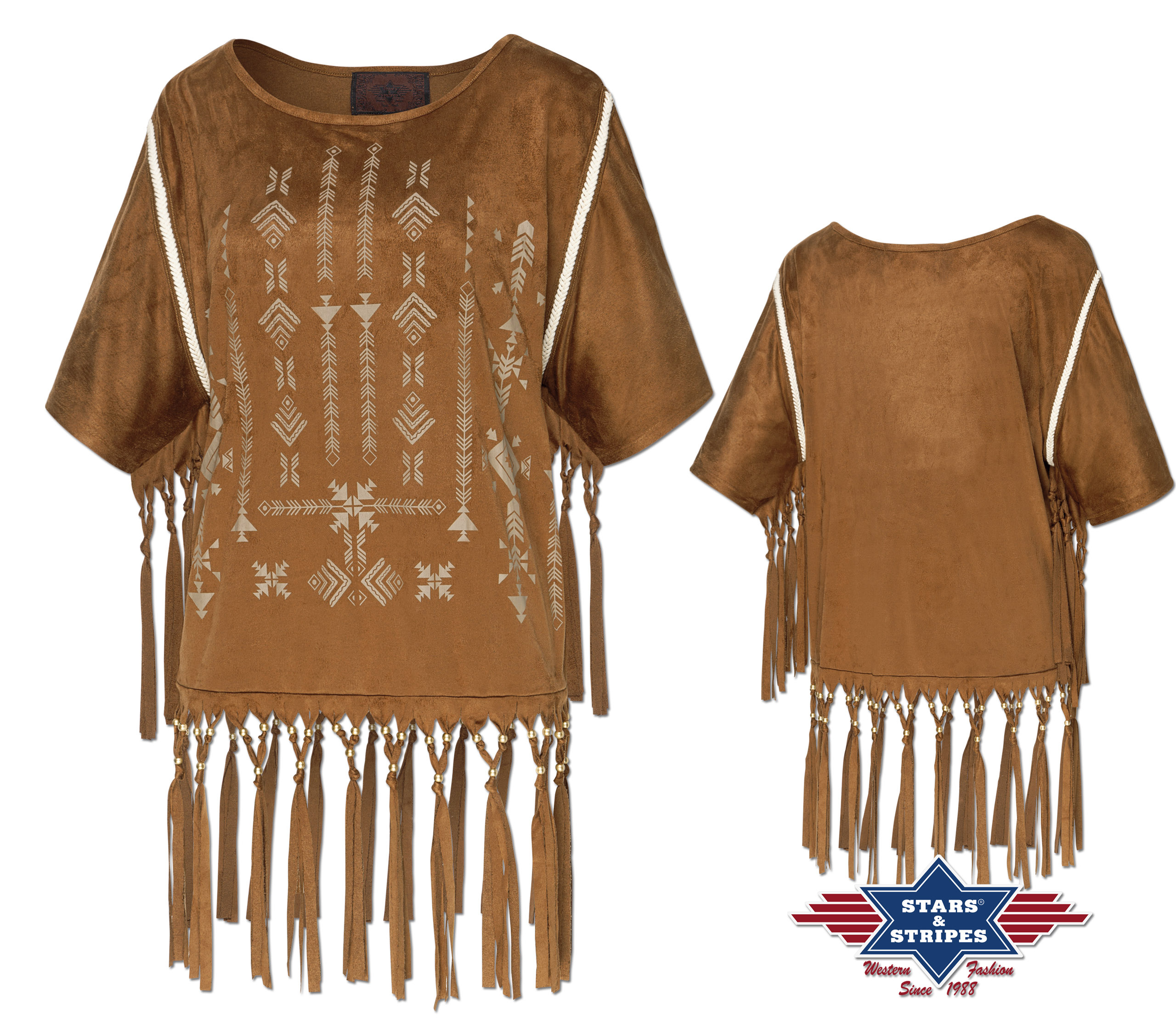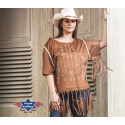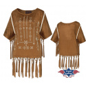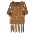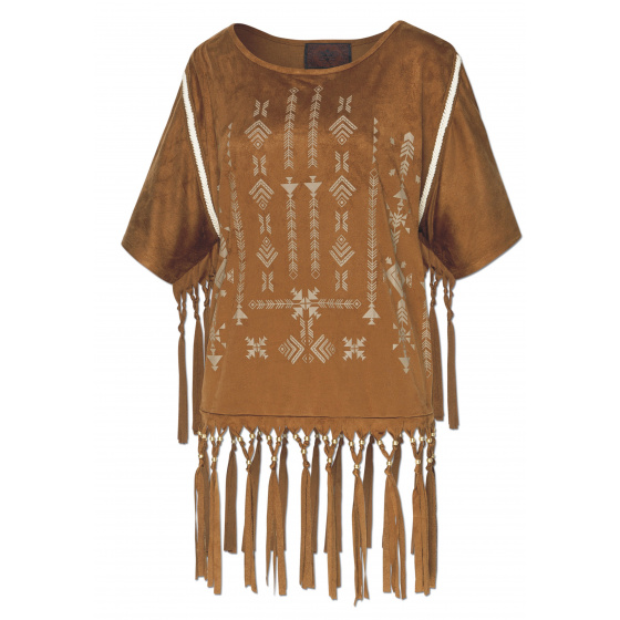 Stylová indiánská halena semišového vzhledu s třásněmi, zdobená vyšíváním a třásněmi.