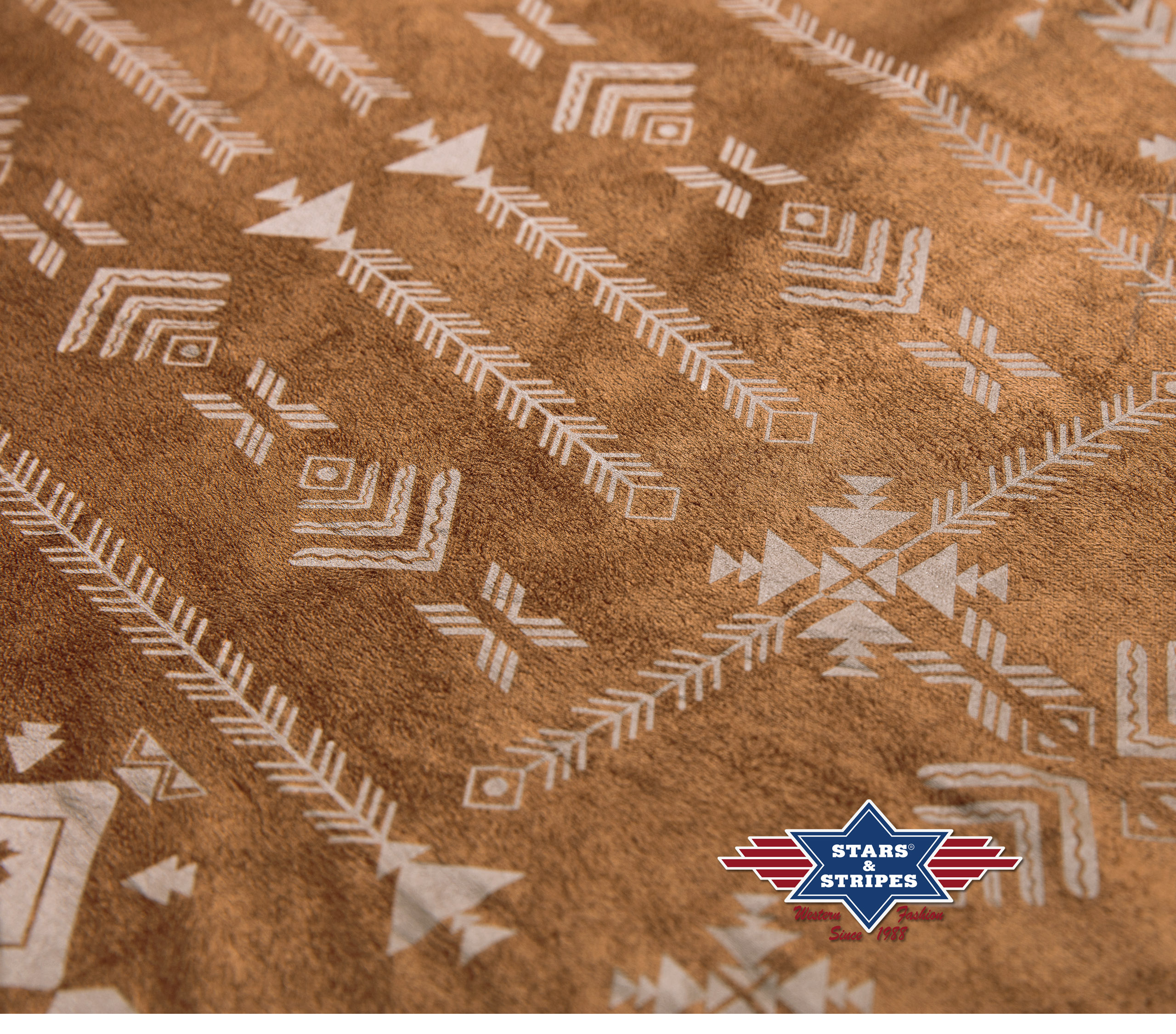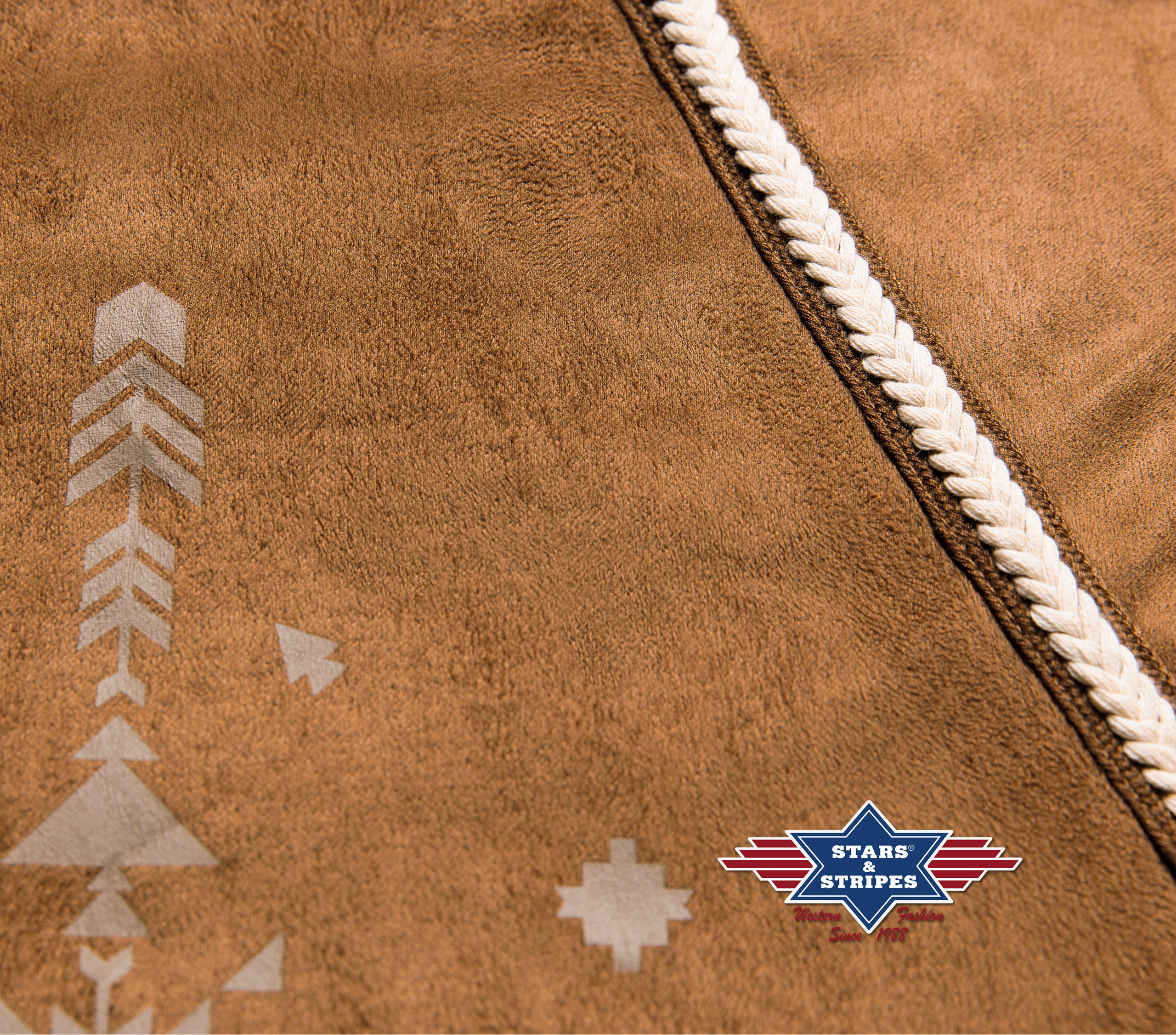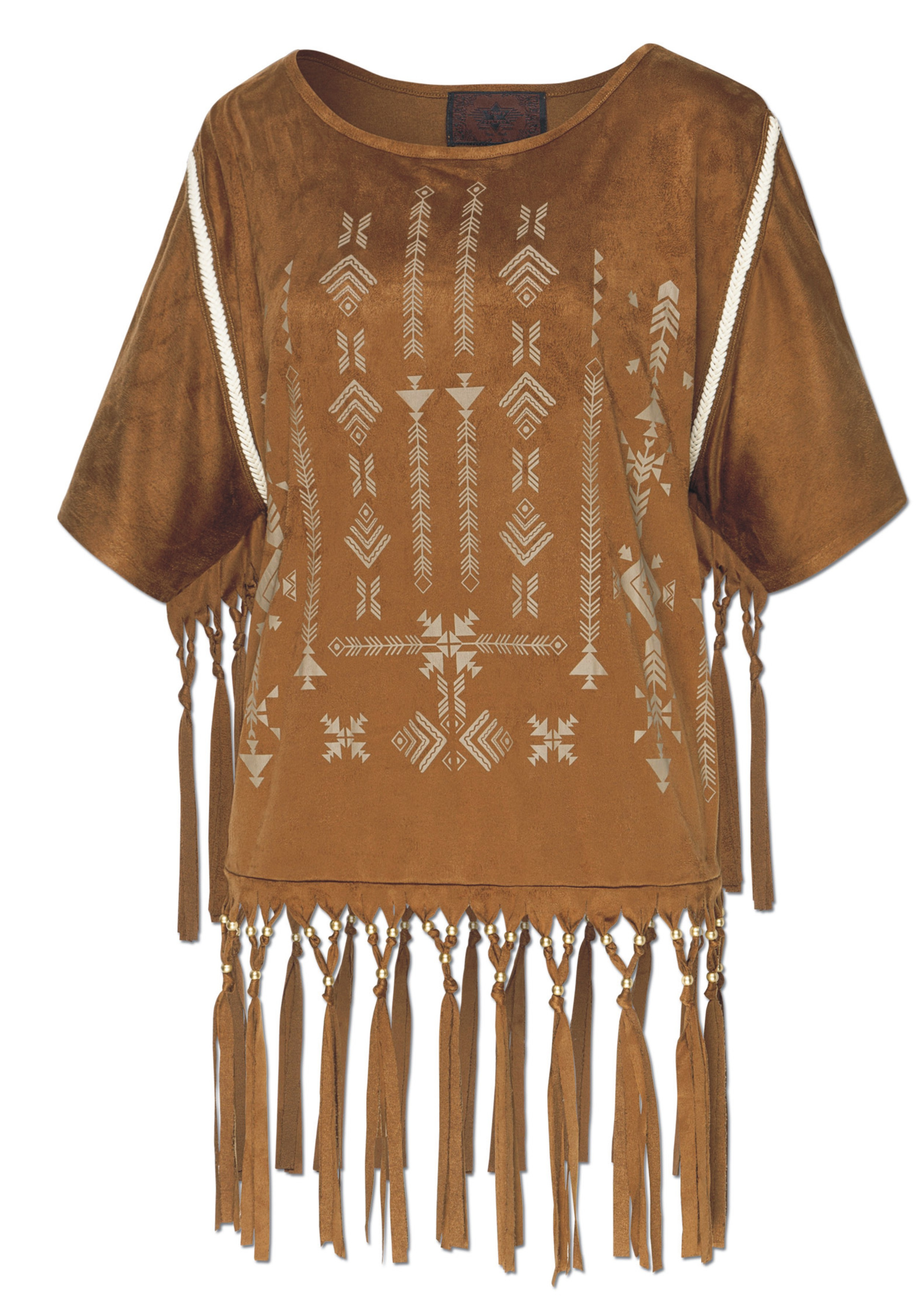 Stylová indiánská halena semišového vzhledu s třásněmi, zdobená vyšíváním a třásněmi.