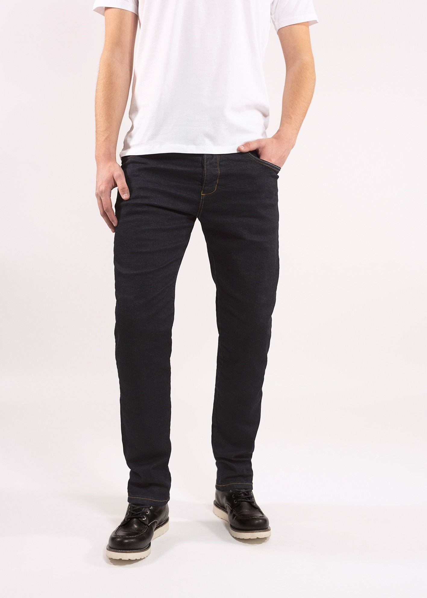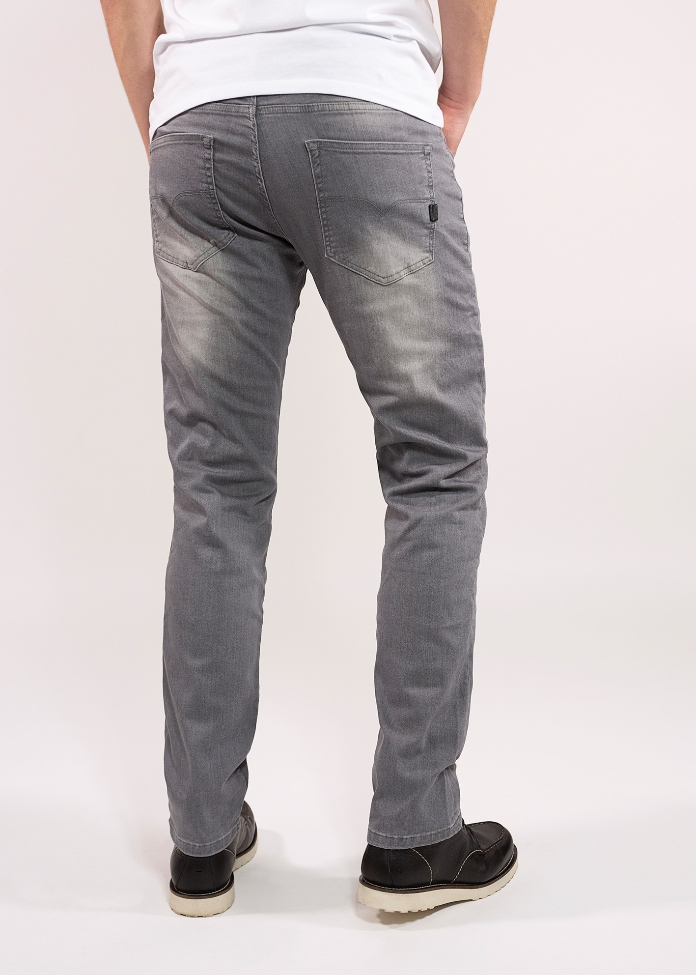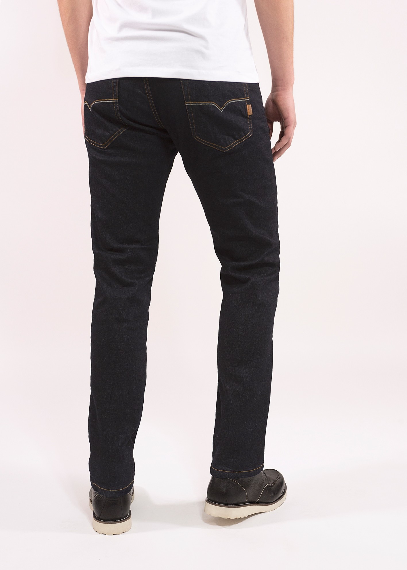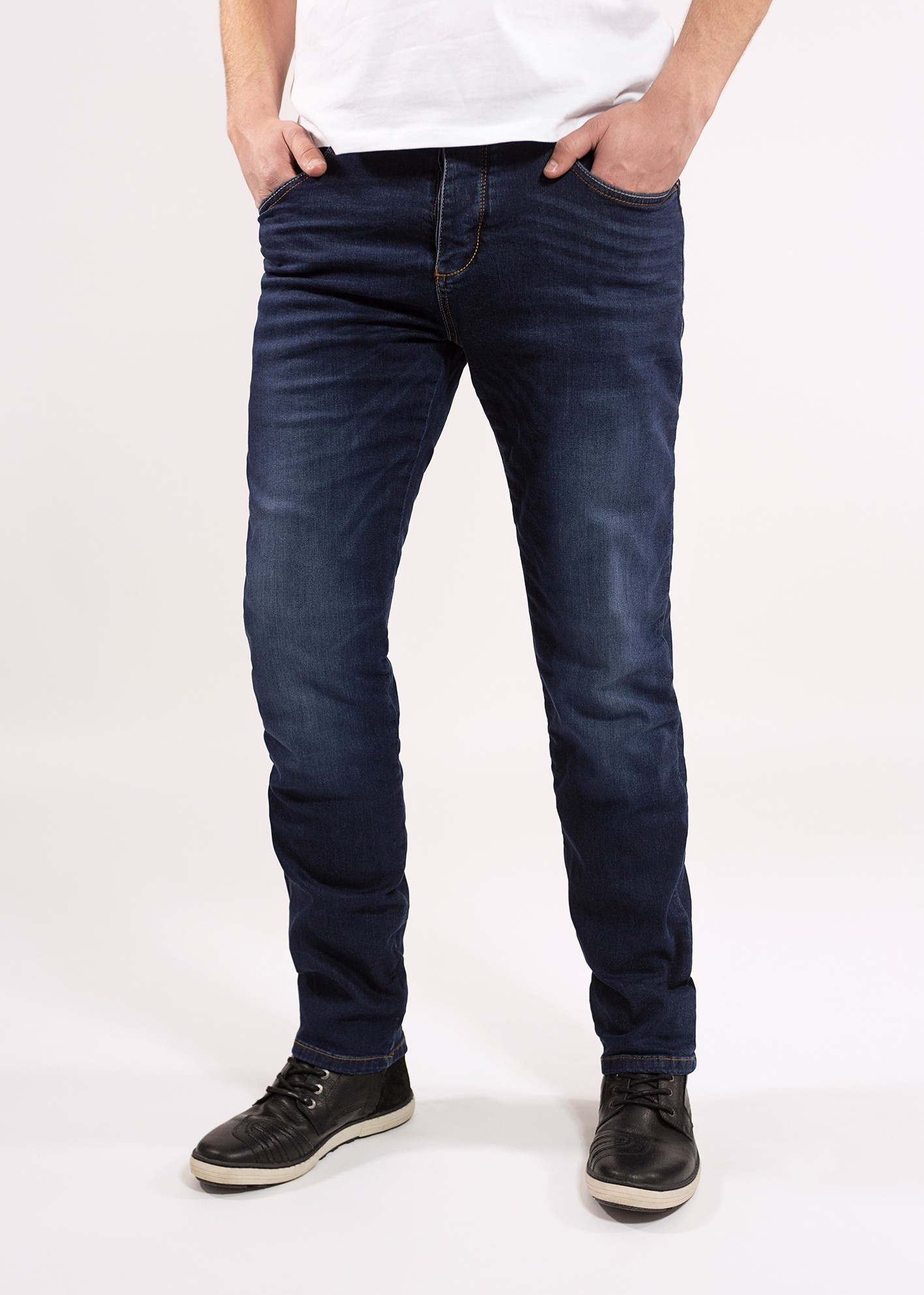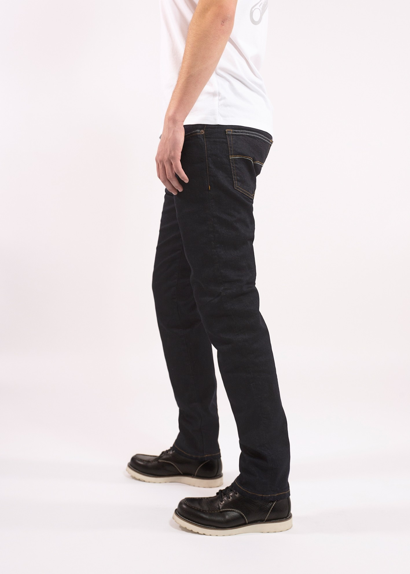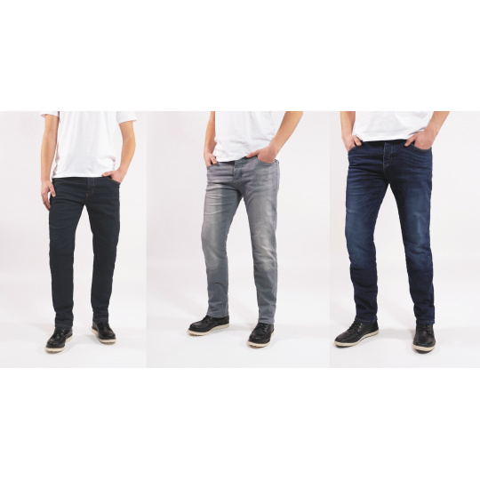 Kevlarové jeansy úzkého střihu (úplé jeansy - elasťáky) speciálně vyvinuté pro jízdu na motocyklu. Úplý střih se výborně hodí k jízdě na motocyklu, minulostí je štípání, škubání a plácání ve větru při vyšších rychlostech. Náš speciální střih kombinovaný s klasickým 5ti kapesním jeansovým střihem je nejen velmi pohodlný, ale také funkční.