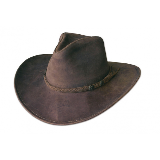 Klobouk z broušené hověziny s pletenou koženou stuhou. Barva hnědá.