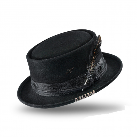 Luxusní ručně vyrobený módní klobouk z kolekce Kastori od německé firmy Stars and Stripes. Zdobení nitěmi a logem značky dotváří jedinečný vzhled.