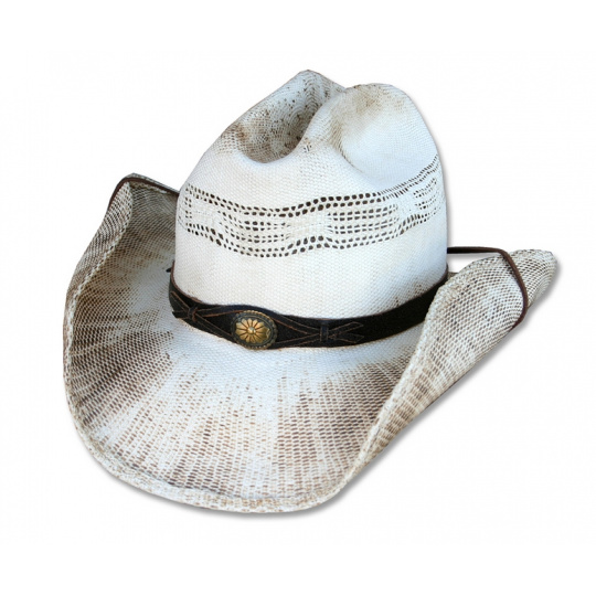 Slaměný klobouk s možností tvarování střechy. Concha na koženém pásku a nastavitelný kožený řemínek na připevnění klobouku.