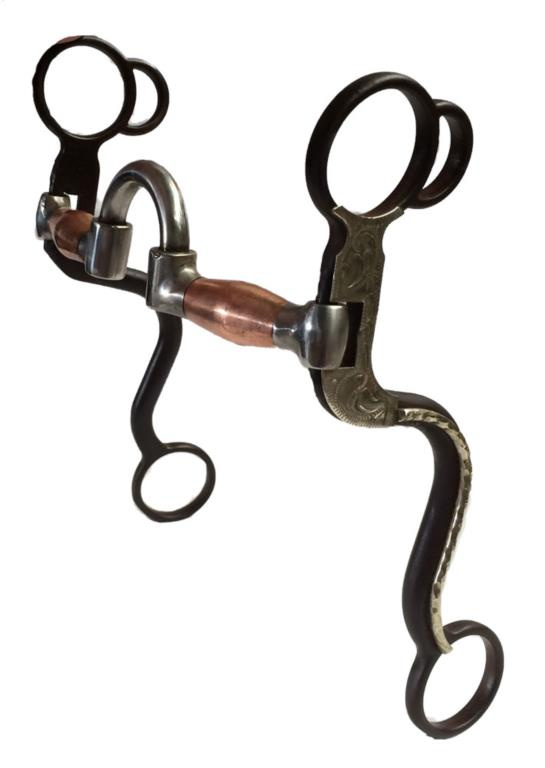 Westernové pákové udidlo zdobené stříbrným gravírováním, střední korekční náustek, měděné válečky.