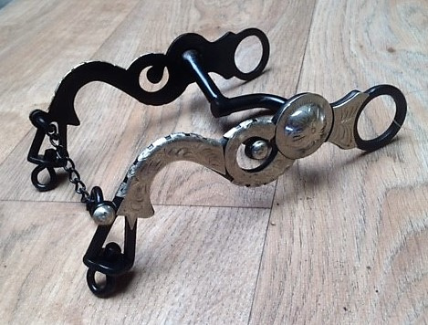 Tmavé westernové pákové udidlo zdobené stříbrným gravírováním, s korekčním náustkem a řetízkem.