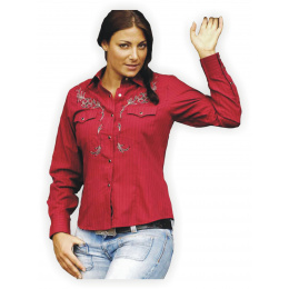 Proužkovaná košile s elegantním vyšíváním vepředu i vzadu doplněné černými kamínky. Klopa na kapse a zapínání na druky. Košile se vyrábí i v pánské verzi pod názvem CLYDE.