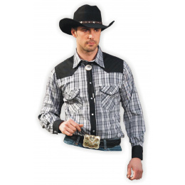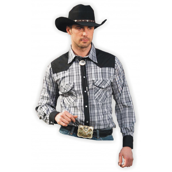 Pánská elegantní košile westernového střihu s dekorativními perleťovými druky a černými rameny, zapínaním a manžetami.