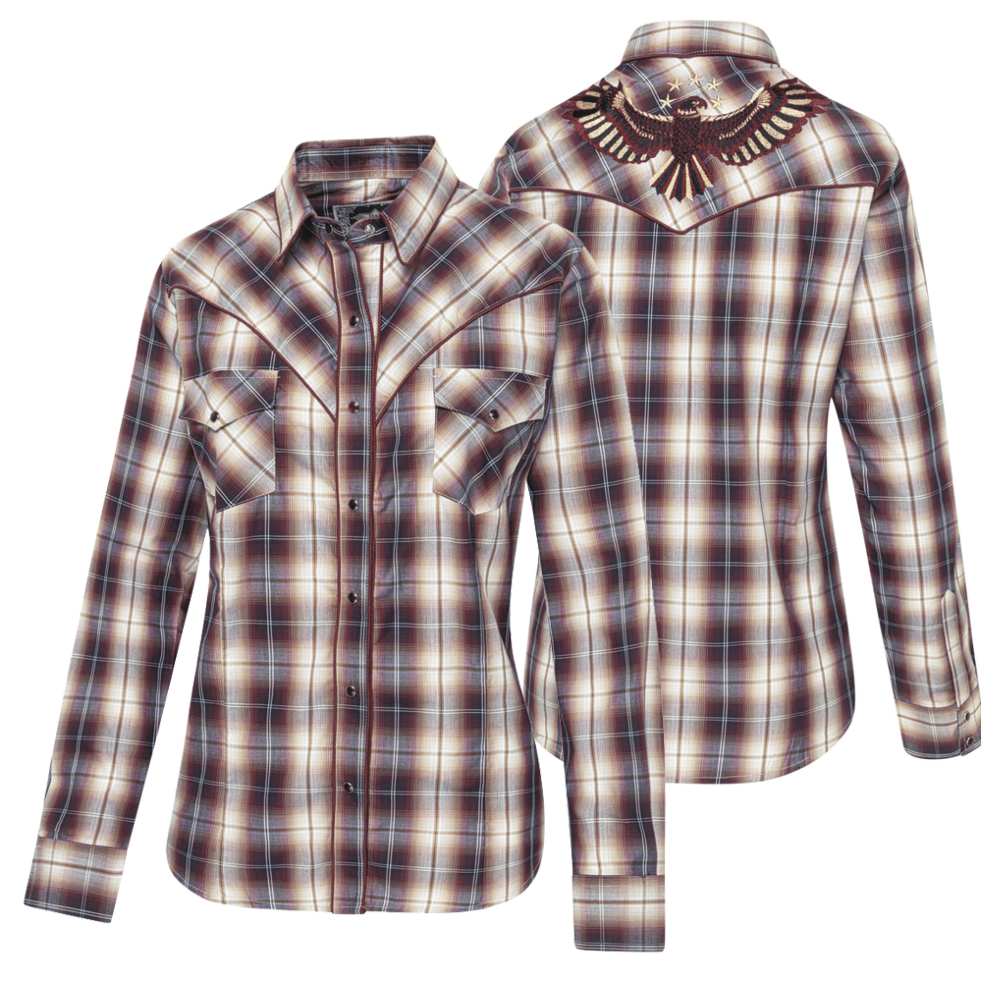 Dámská westernová halenka s výrazným kostkovaným vzorem v tlumených tónech a vyšívaným orlem na zádech. Typické westernové sedlo, nakládané náprsní kapsy a perleťové druky dodávají košili autentický kovbojský šarm. Všestranná košile, která se perfektně hodí k ležérnímu, ale zároveň stylovému oblečení. Do páru a perfektně se hodí ke košili NATHAN.
