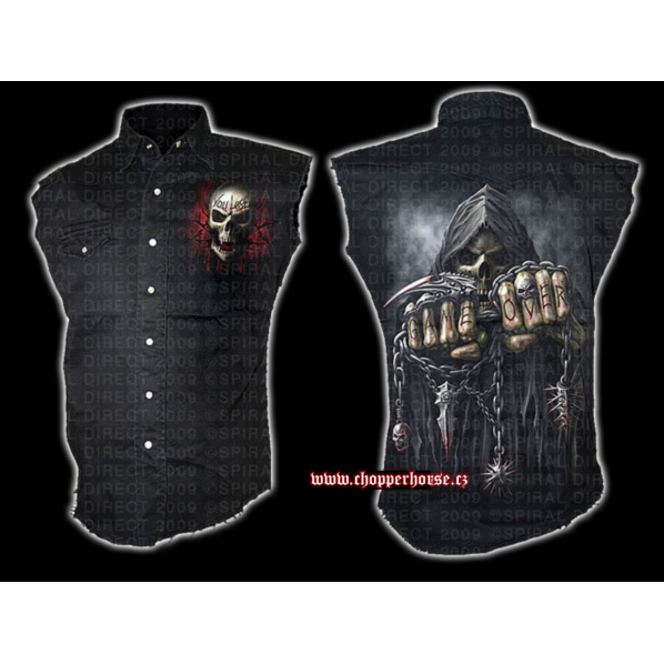 Popis produktu košile s motivem Game OverČerná bavlněná košile bez rukávů s velice kvalitním potiskem, patina a otrhané rukávy. Velikost (ramena - pas - délka): M - 48 - 104 - 63 cm L - 51 - 108 - 65 cm XL - 53 - 112 - 67 cm XXL - 58 122 72 cm