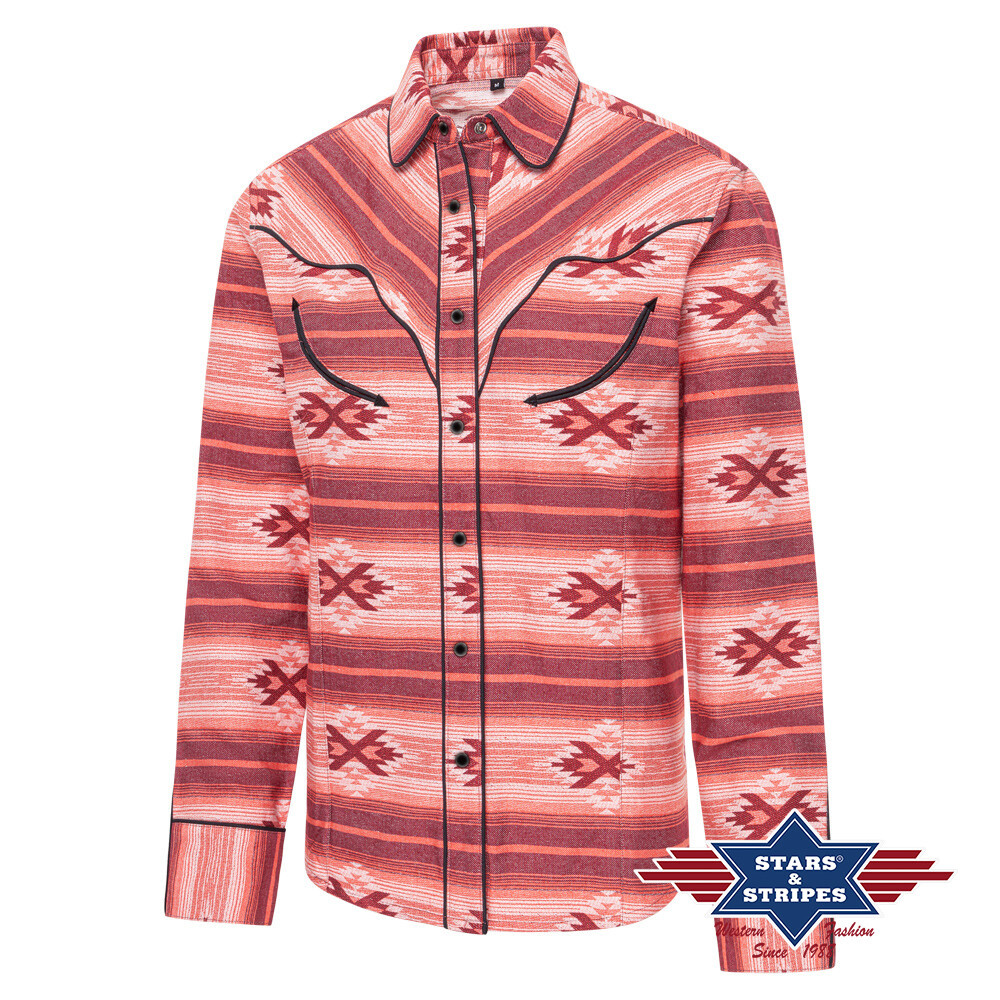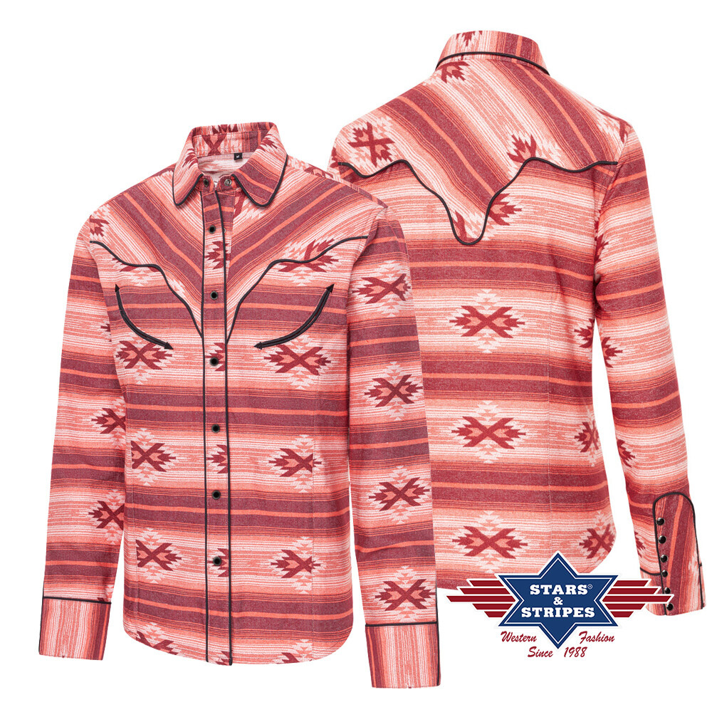 Stylová dámská westernová košile s etnickými vzory zaujme teplým a zemitým nádechem v červených tónech. Klasické westernové sedlo, lemování, falešné náprsní kapsy a westernové manžety se 6 patentními knoflíky zdůrazňují autentický westernový styl. Ideální pro každého, kdo hledá osobitý a odvážný styl.