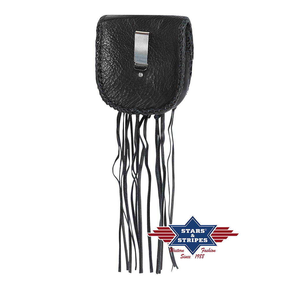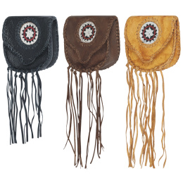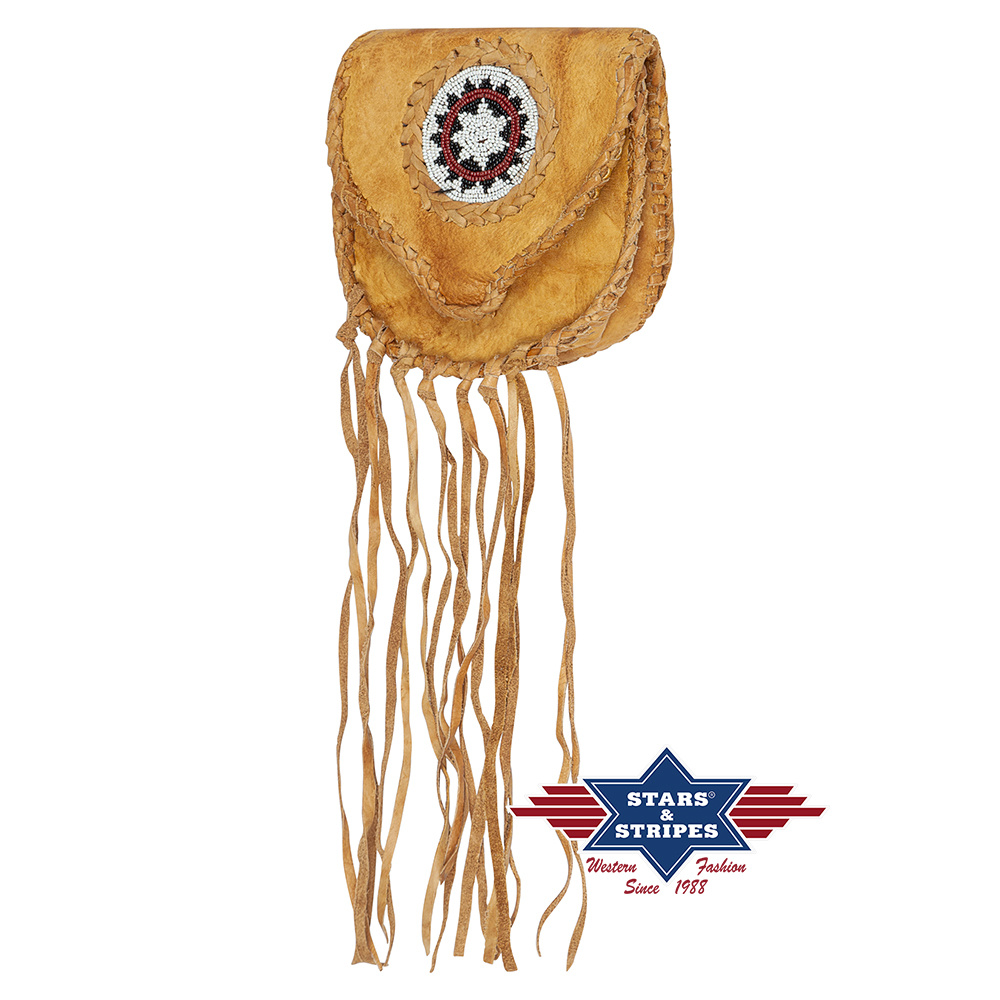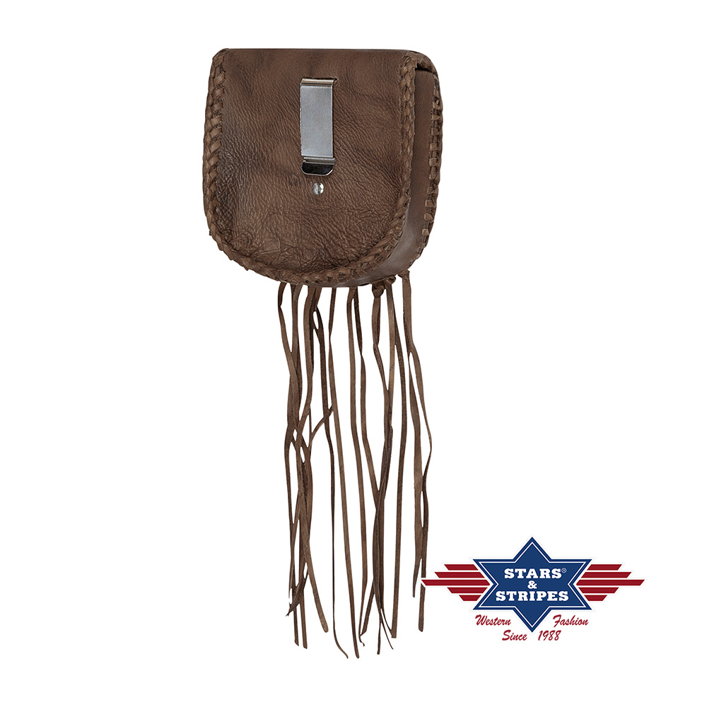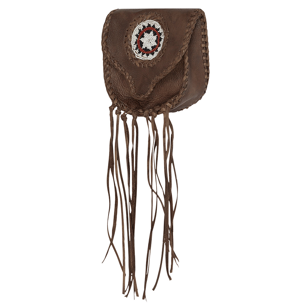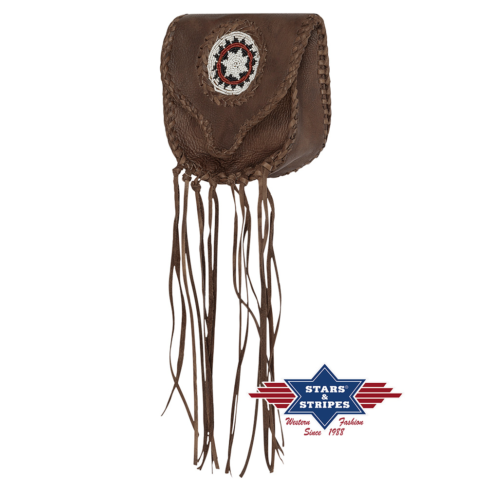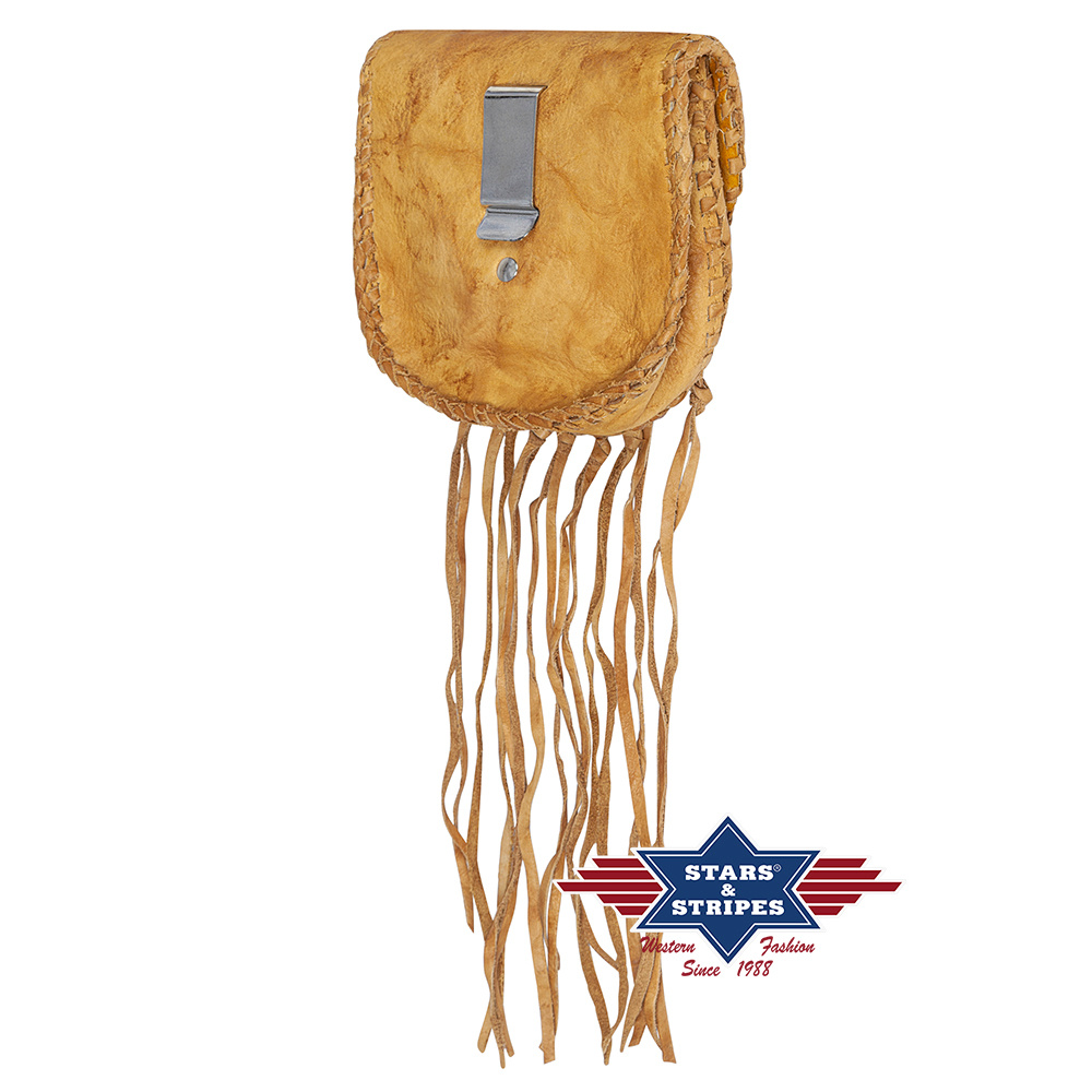 Okouzlující stylová kapsa na opasek zdobená indiánskými motivy, šněrováním a třásněmi. Zajímavý barevný efekt patina.