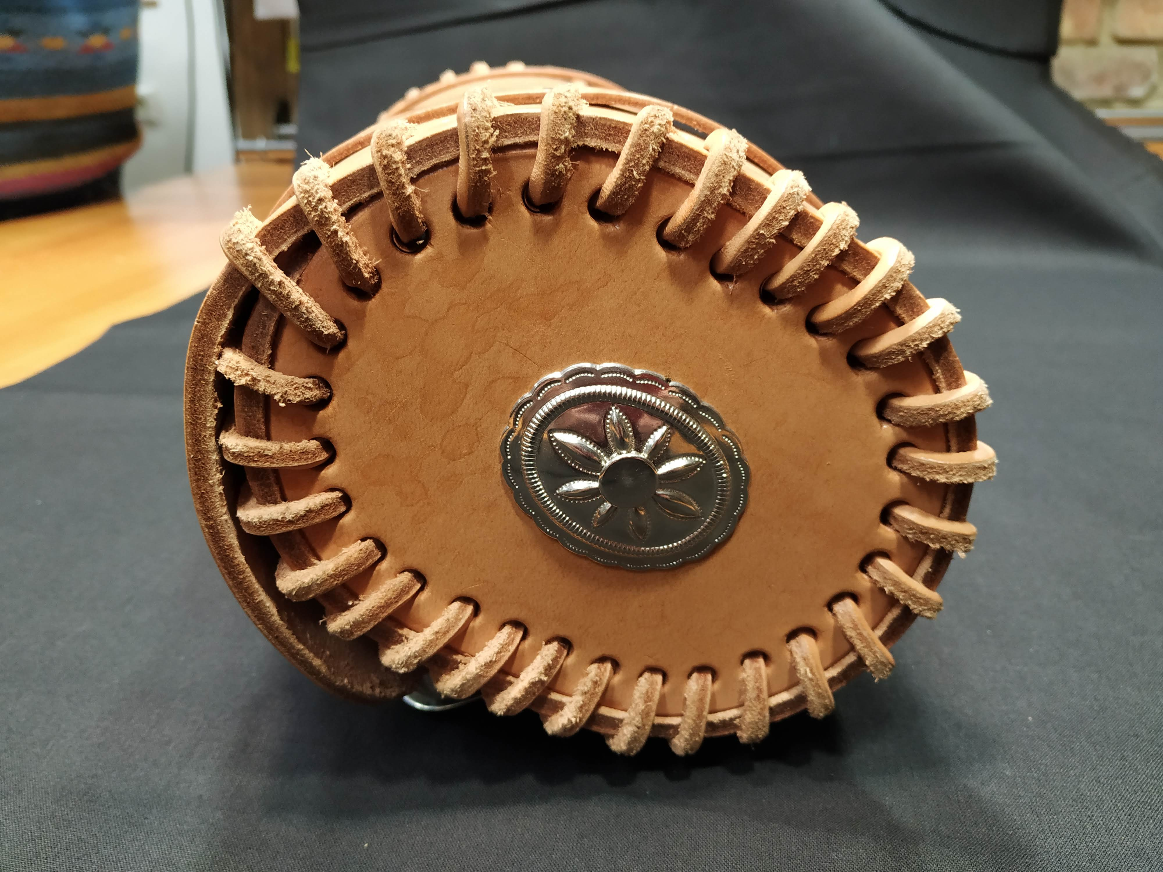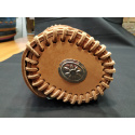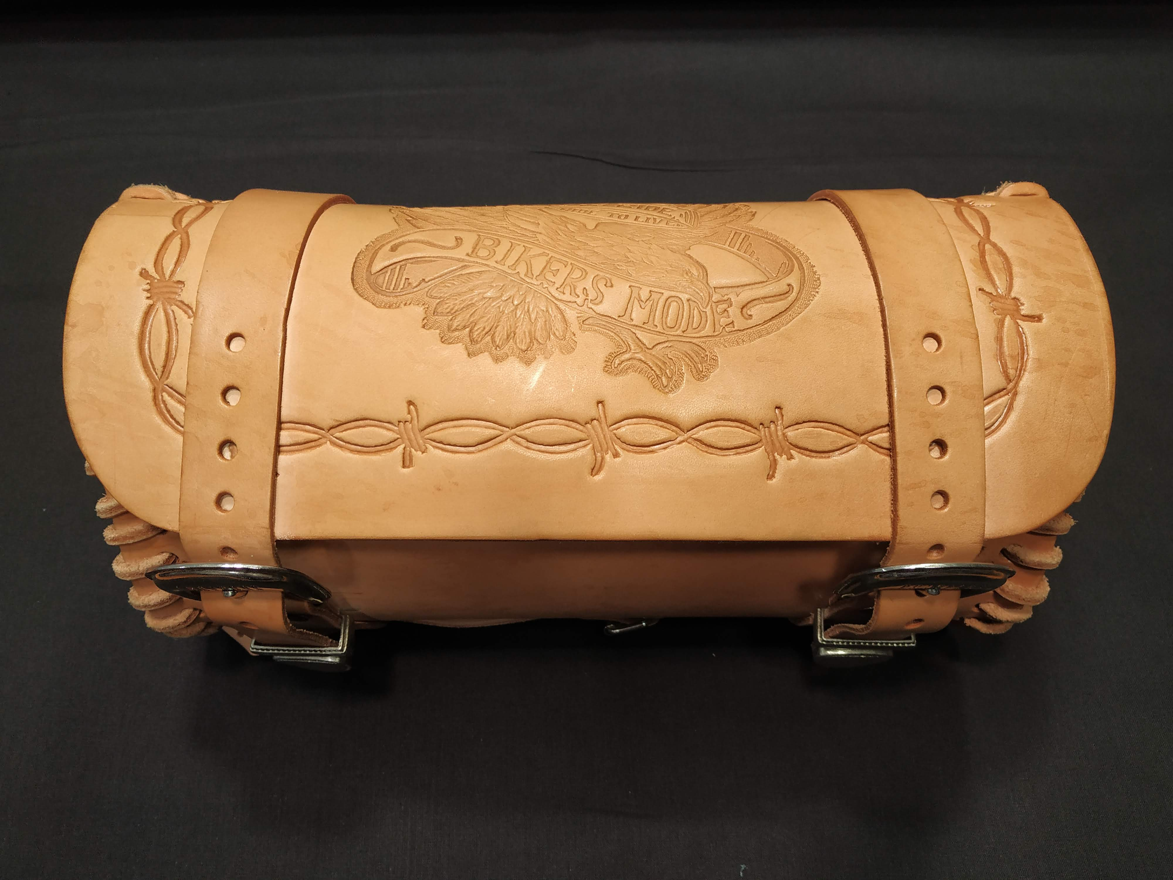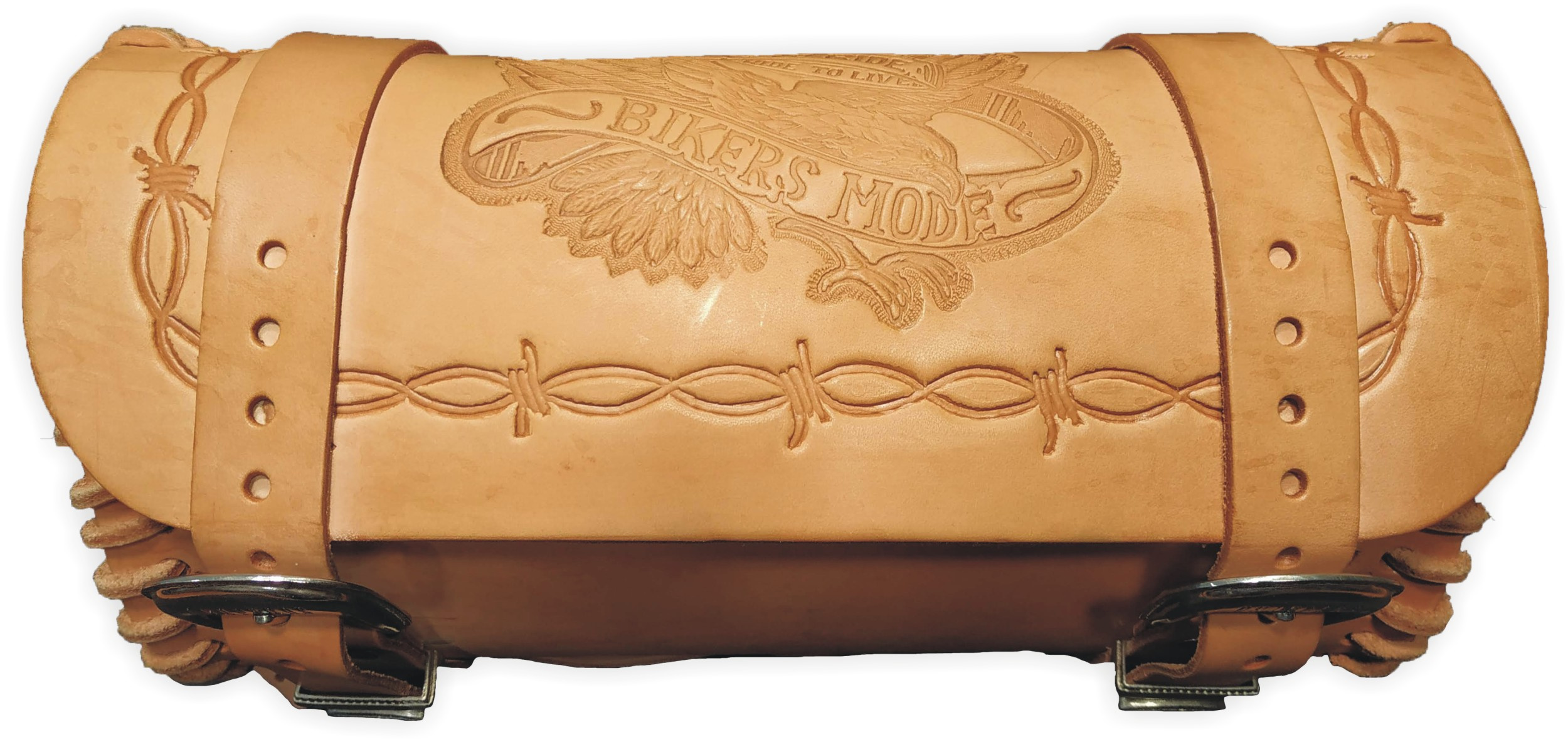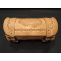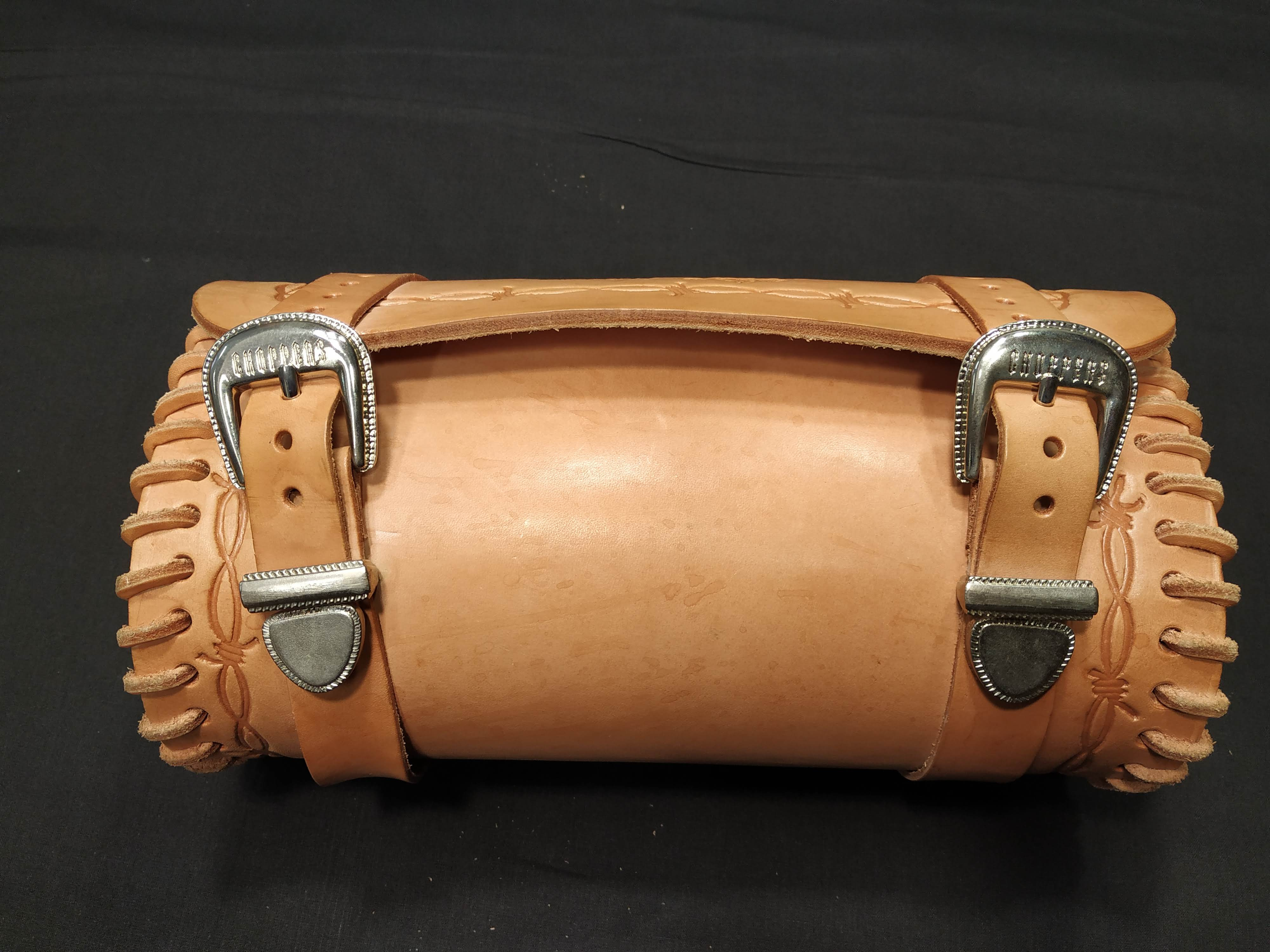 Kožená rolka, ovál, se zdobením. Možno upevnit na přední vidlici, opěrku, rám ap. pomocí pásků. Kvalitní kůže a špičkové zpracování.