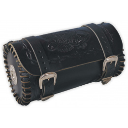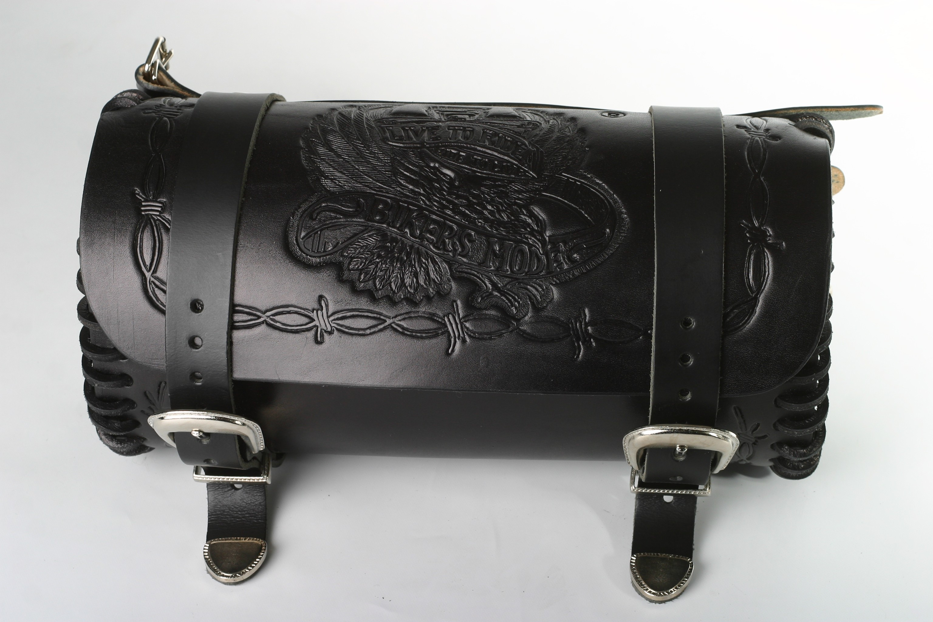 Kožená rolka, ovál, se zdobením. Možno upevnit na přední vidlici, opěrku, rám ap. pomocí pásků. Kvalitní kůže a špičkové zpracování.