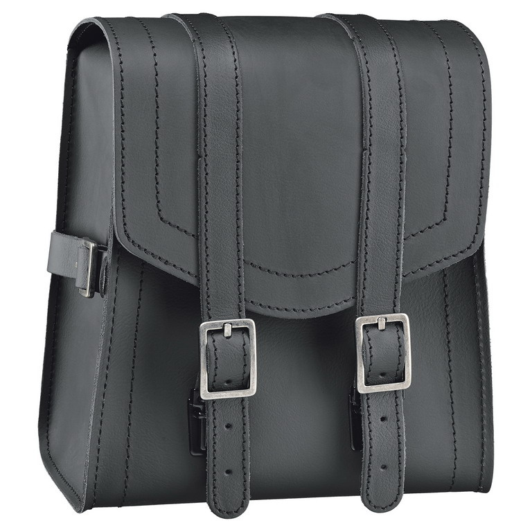 Brašna na opěrku motocyklu, zadní strana kufru je uzpůsobena pro snadné přichycení k opěrce spolujezdce => pomocí dlouhého koženého pásku s masivní ocelovou přezkou. Zavírání brašny pomocí koženého pásu s kovovou přezkou a rychlopřezkou.