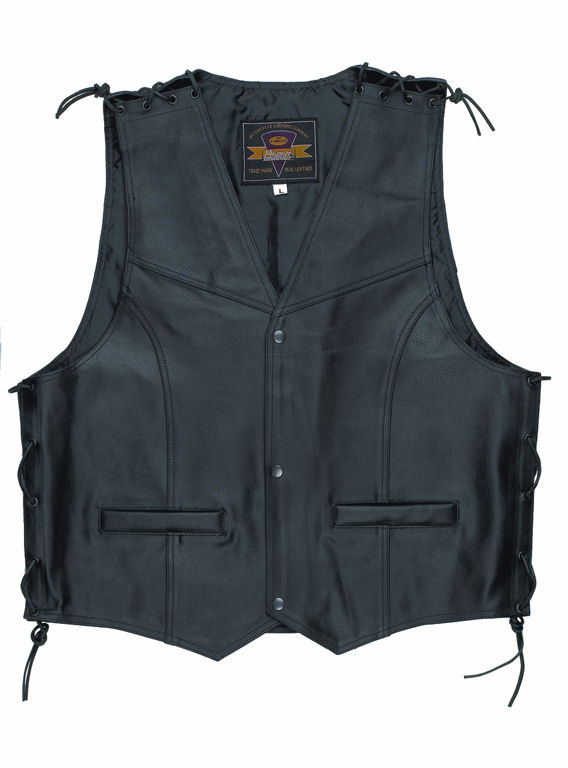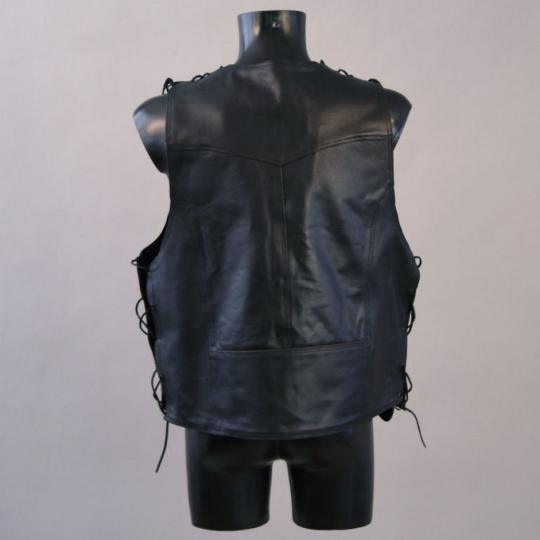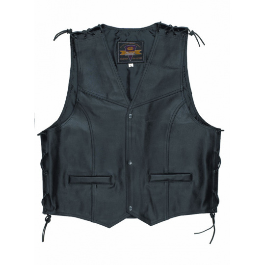 Popis produktu Kožená vesta PatchPánská vesta z hladké hovězí kůže se šněrováním na bocích a ramenech. Dvě malé kapsy. Zapínání kovovými drucky. Lehká podšívka (100% polyester). Barva: černá