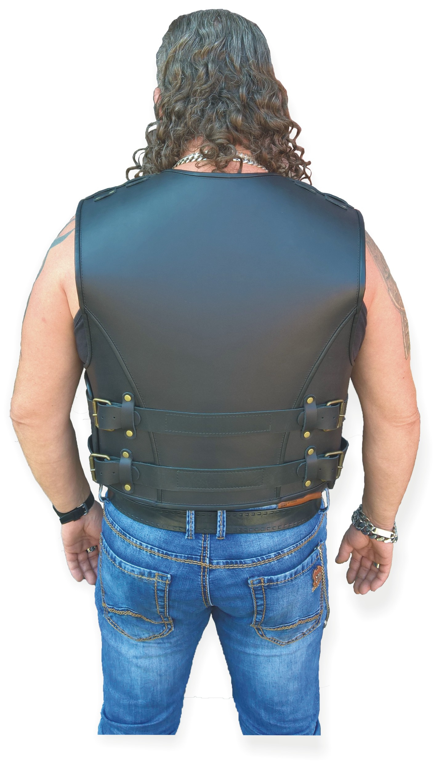 Luxusní motorkářská vesta s masívními pásky na bocích a ramenou z nejkvalitnější hovězí kůže BIKERSMODE VP-V.