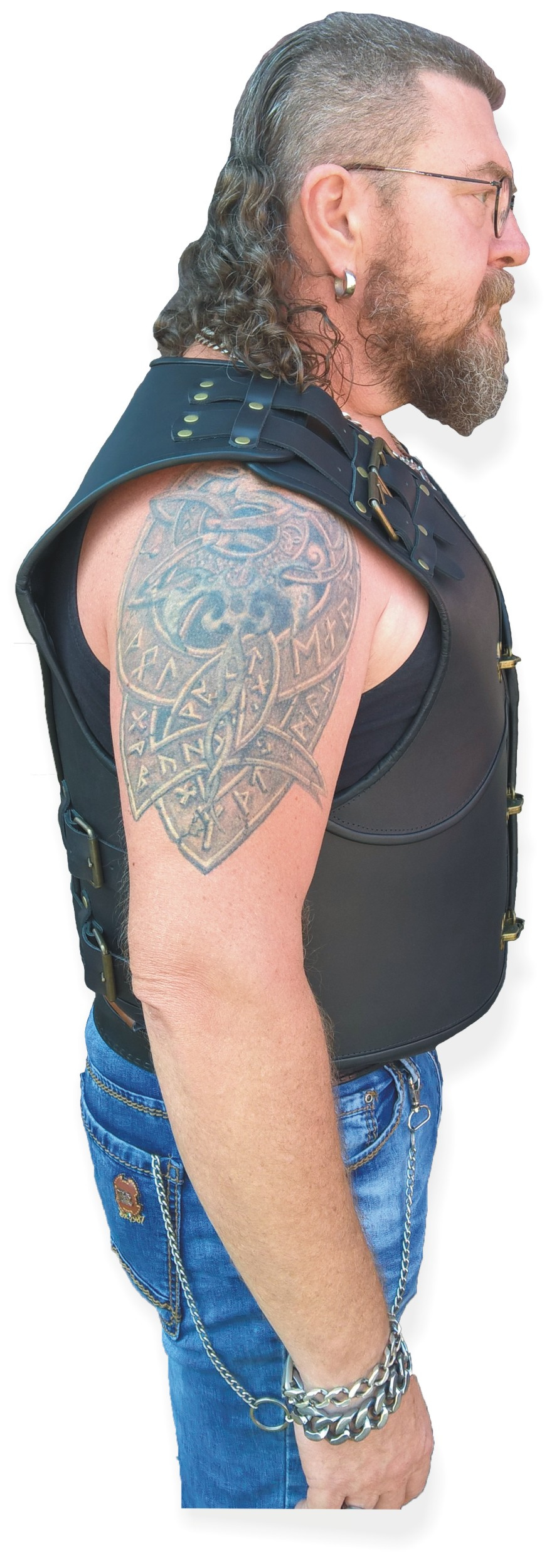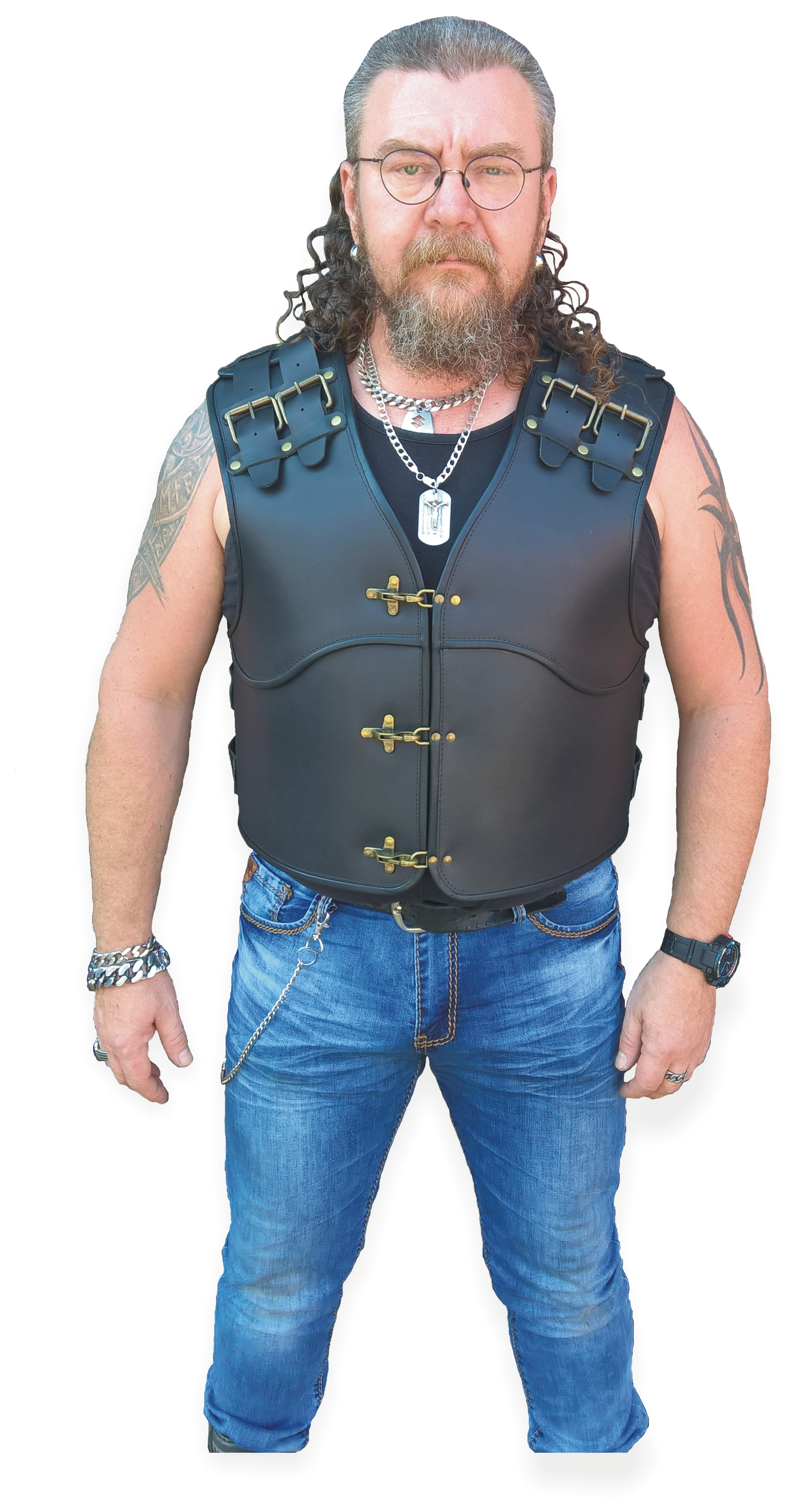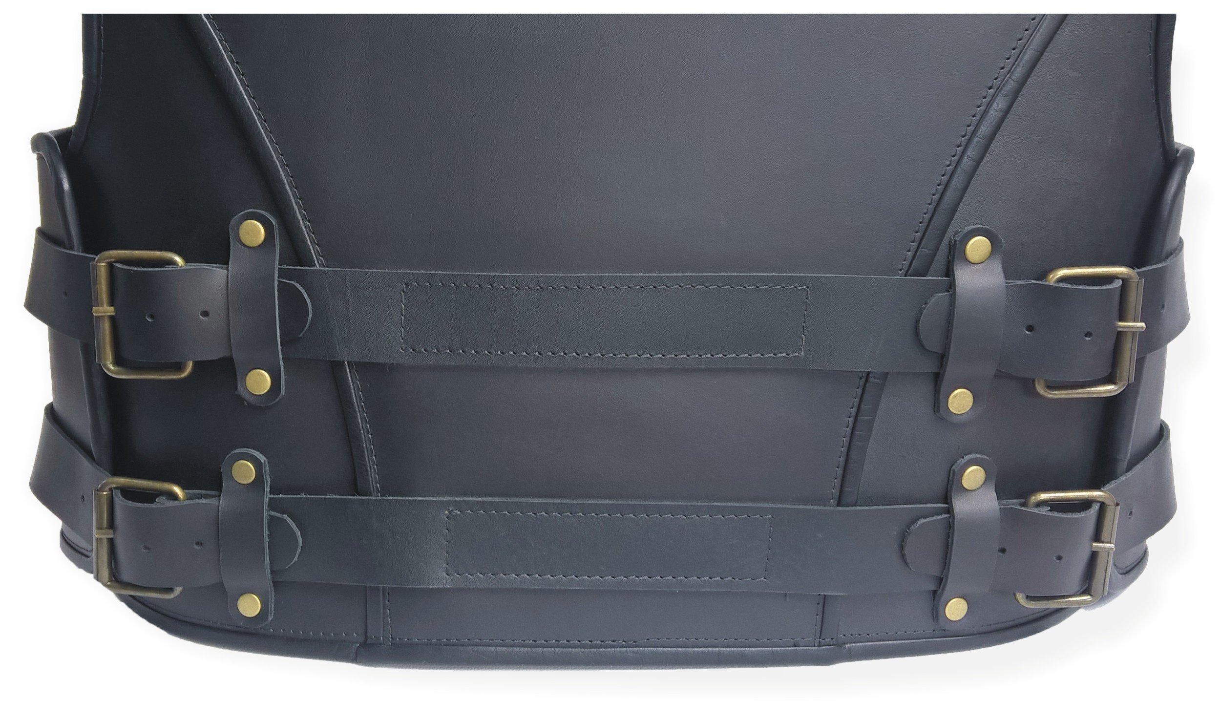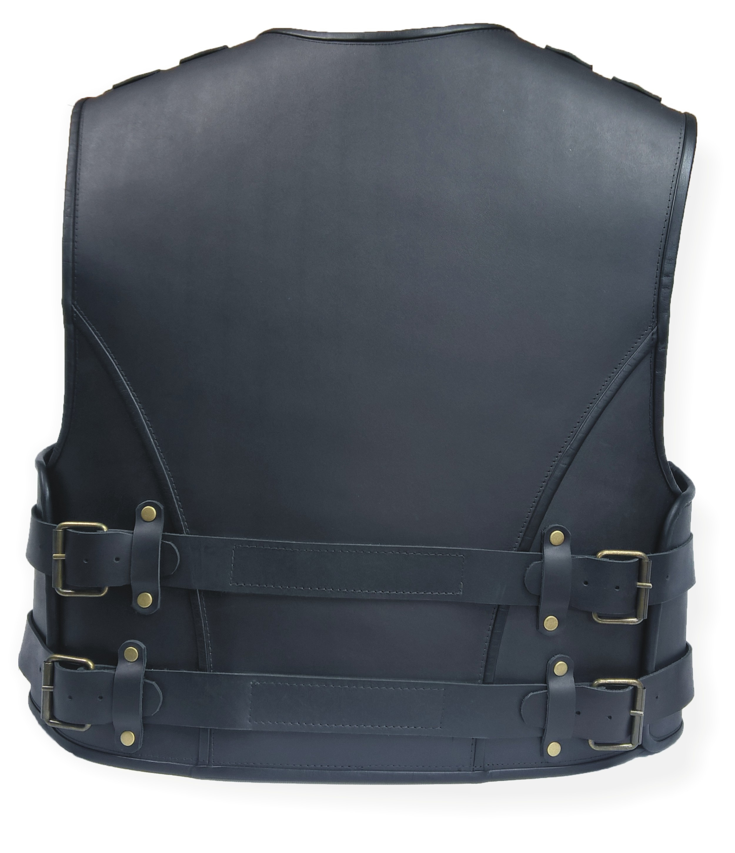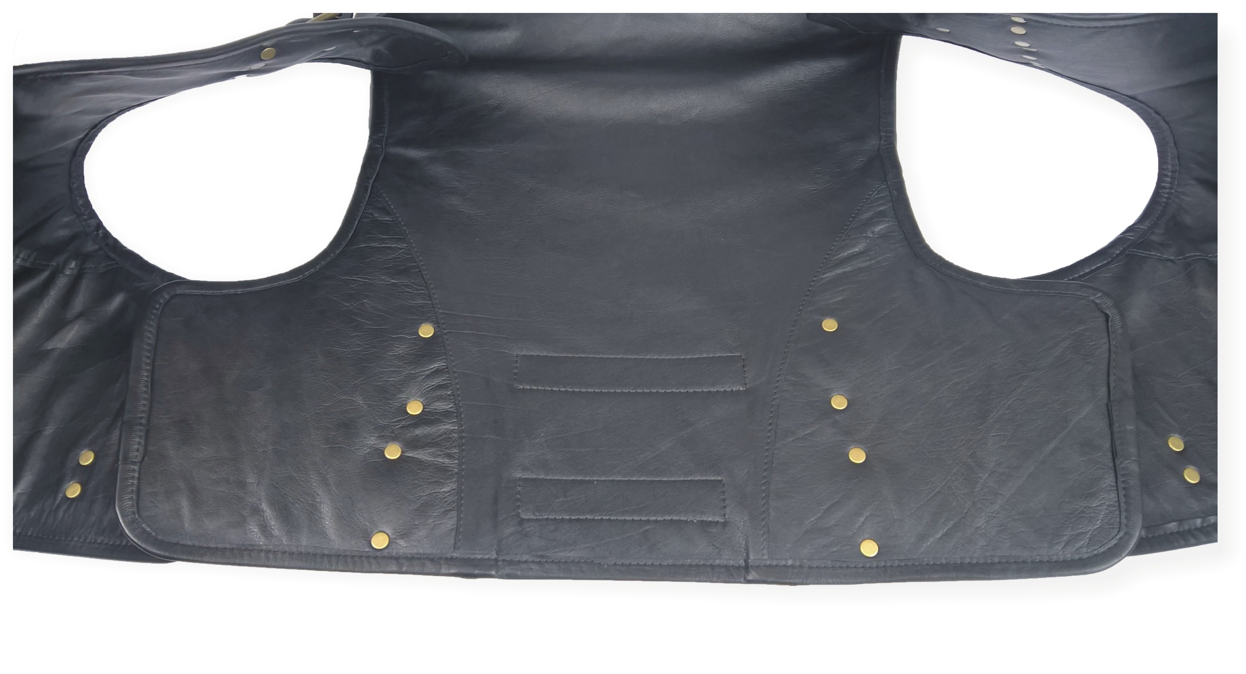 Díky páskům na bocích a ramenou lze jednoduše upravit velikost, např. při použití na triko - bundu. Vesta je vyrobená z kvalitní pevné kůže tloušťky 1,8 - 2 mm, takže vytváří na těle "krunýř", podšívka z luxusní jemné teletiny celou vestu "změkčí" pro příjemný pocit a pohodlné nošení.