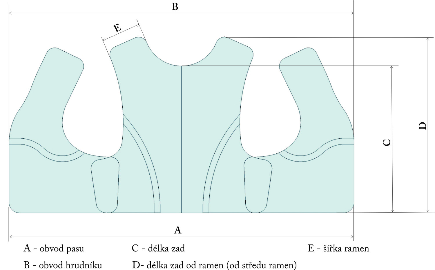 Velikost: šijeme na zakázku po individuální domluvě, pro výrobu vesty budeme potřebovat znát míry podle níže uvedeného obrázku, délku zad C, D doporučujeme kratší - cca do pasu - kvůli tuhosti vesty by vám mohla při posezu na motocyklu zvedat helmu
