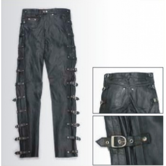 Kalhoty z jemné kůže, jeansového stylu s přezkama na bocích a nohavicích.
