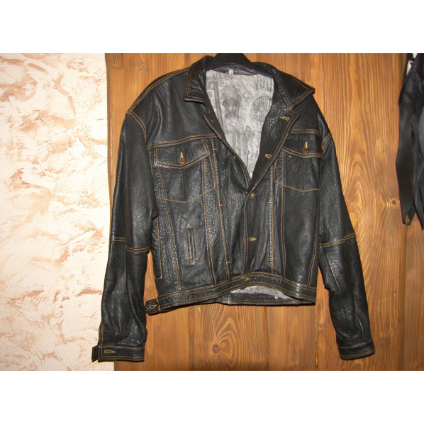 Popis produktu koženková bundaKvalitní koženková bunda riflového střihu ("džiska"). Barva: černá s hnědou nití Velikost: L (hrudník cca 126 cm) Stav: nošená, jako nová, na levém rukávu malý kaz