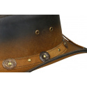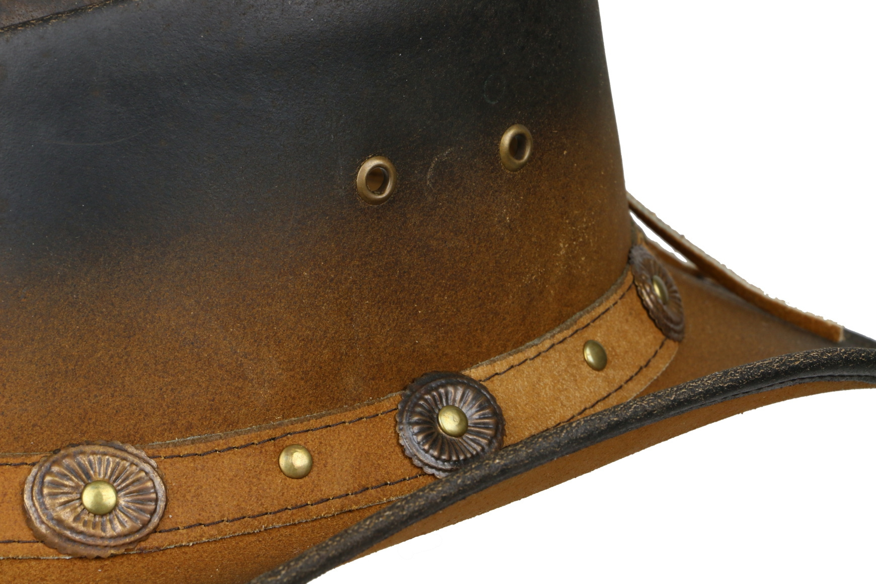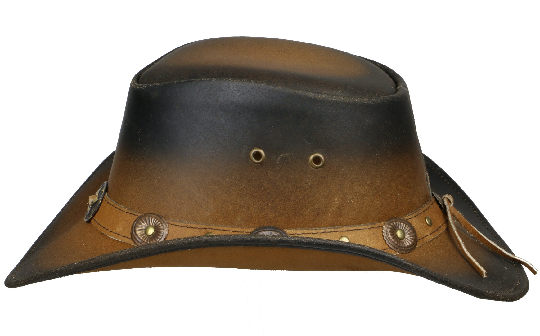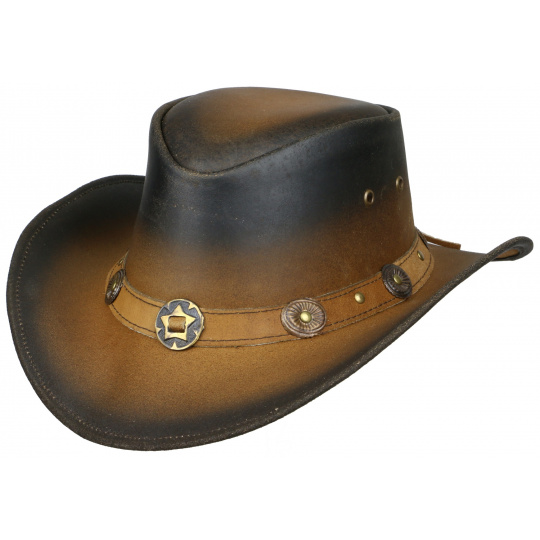 Je vyroben z hovězí impregnované kůže odolné vůči počasí a ozdoben conchos s páskem z pravé kůže. Má praktická očka pro snadné odvětrání v horkých dnech. V okraji krempy je ocelový drát pro individuální tvarování.