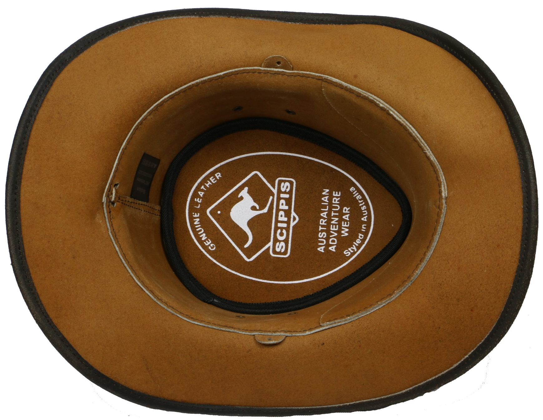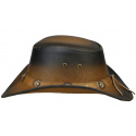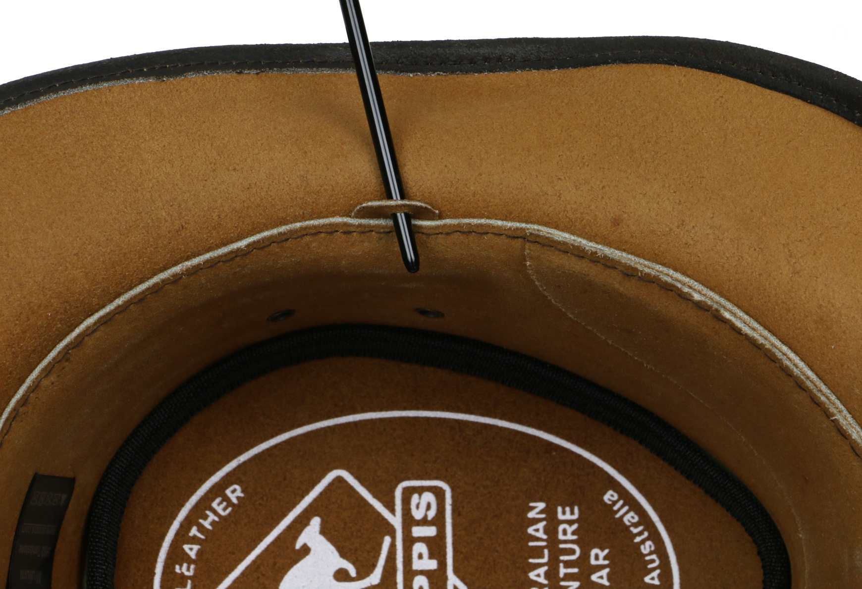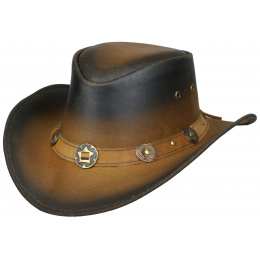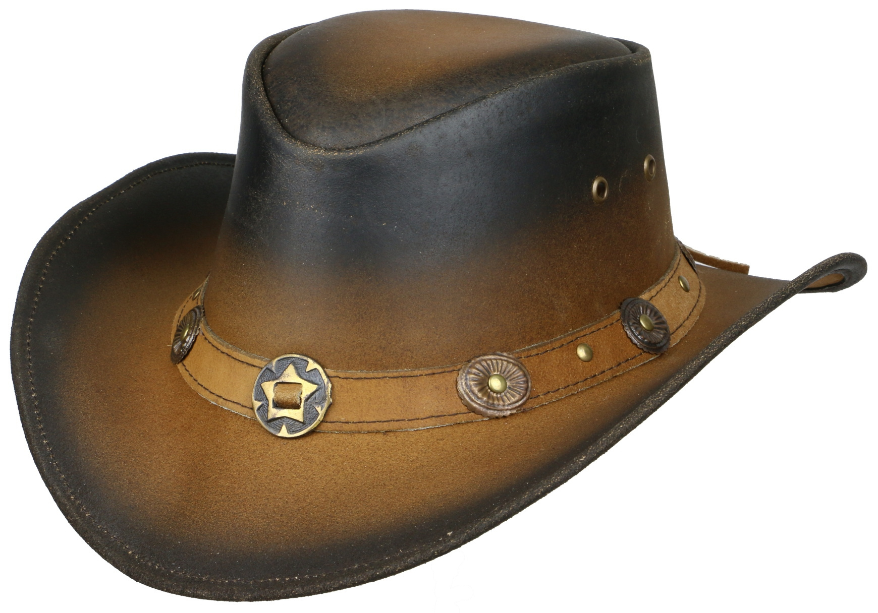 Je vyroben z hovězí impregnované kůže odolné vůči počasí a ozdoben conchos s páskem z pravé kůže. Má praktická očka pro snadné odvětrání v horkých dnech. V okraji krempy je ocelový drát pro individuální tvarování.