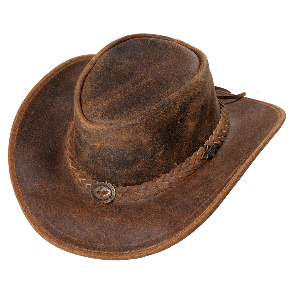 Stylový kožený westernový klobouk z voskované broušené kůže je ozdoben koženým pleteným řemínkem, pohodlné nošení zajišťuje měkký pásek uvnitř po obvodu klobouku.