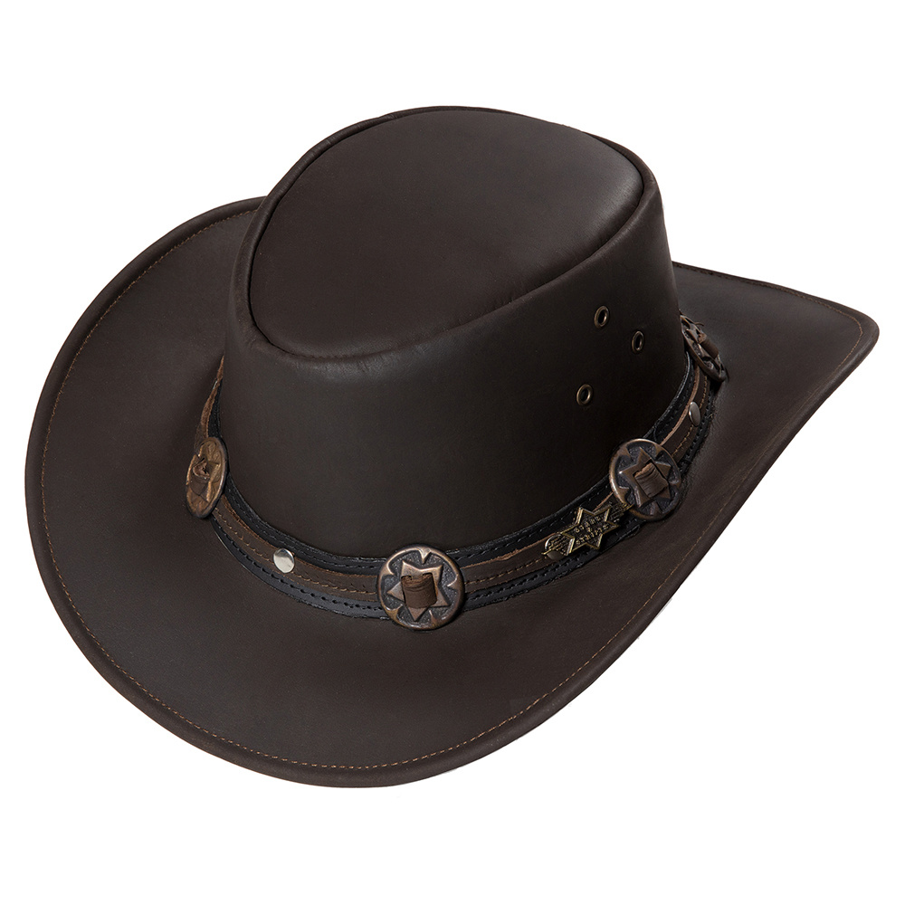 Stylový kožený westernový klobouk z voskované kůže je ozdoben koženým řemínkem s končaky a nýty, pohodlné nošení zajišťuje měkký pásek uvnitř po obvodu klobouku.