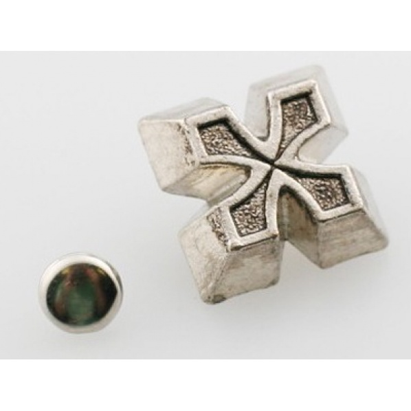 Popis produktu KřížKříž. Nýtovací ozdoba nejen do kůže. Velikost: 17 x 17 mm, trn 5 mm Barva: chromová-černá, patina Materiál: zinek