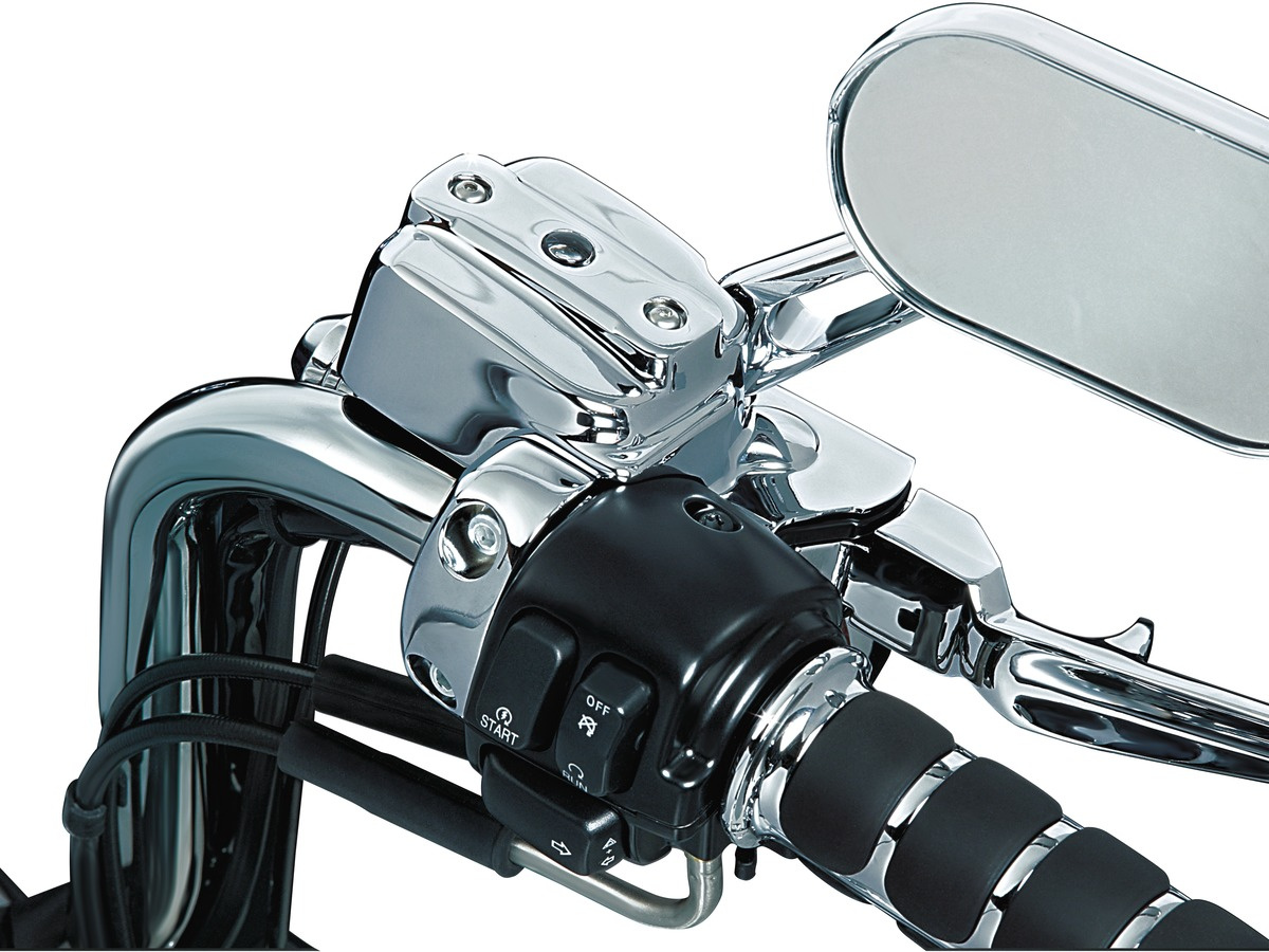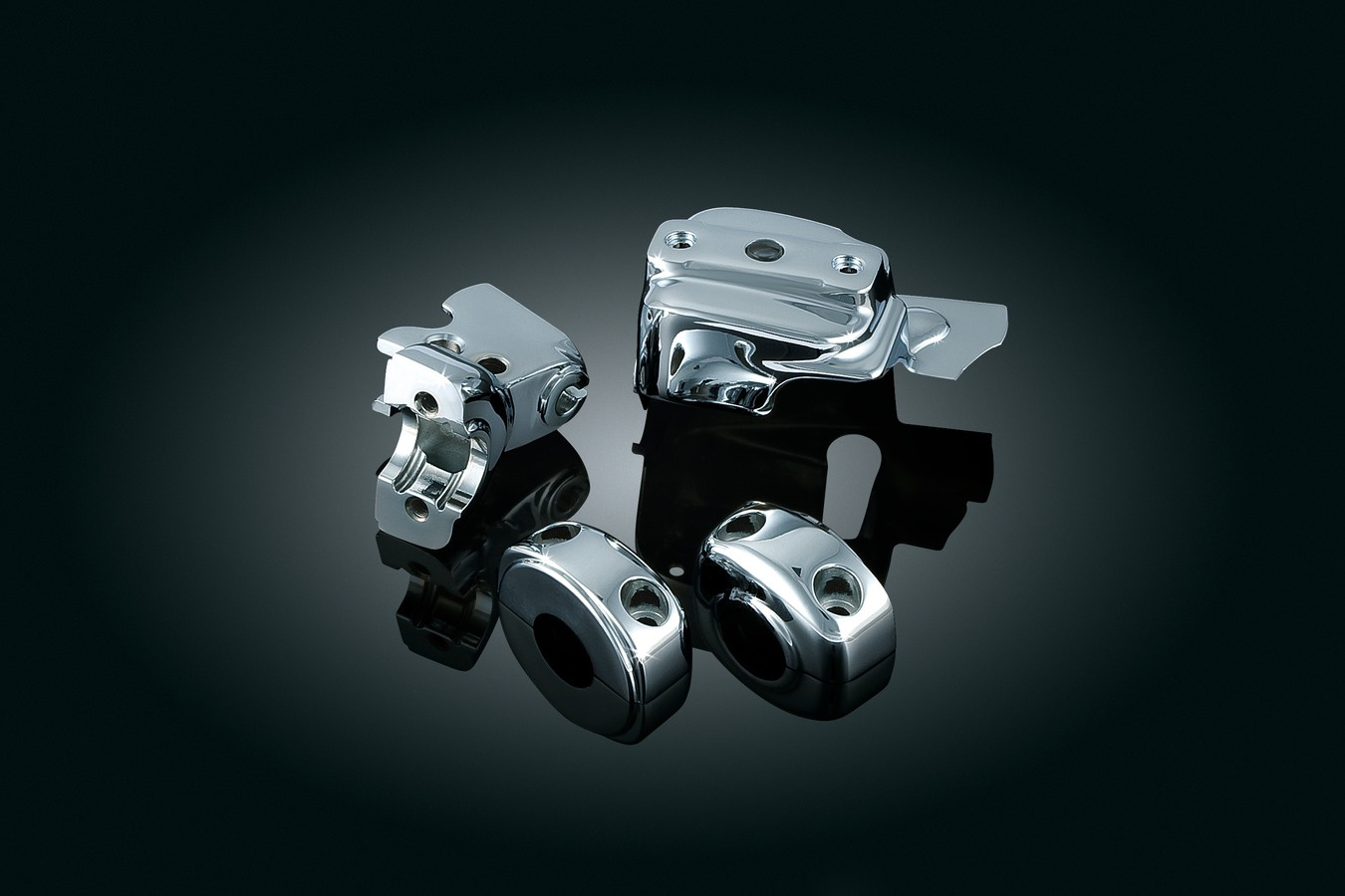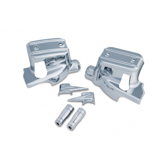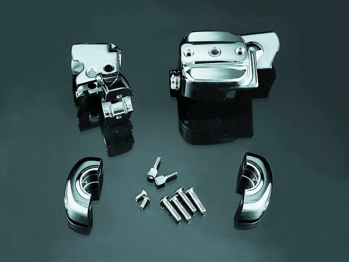 Sada krytů Kuryakyn pro zakrytí nádobky brzdové/spojkové nádobky, držáků a souvisejících částí brzd. Snadný způsob, jak zakrýt chromem poslední nevzhledné kousky na řídítkách.