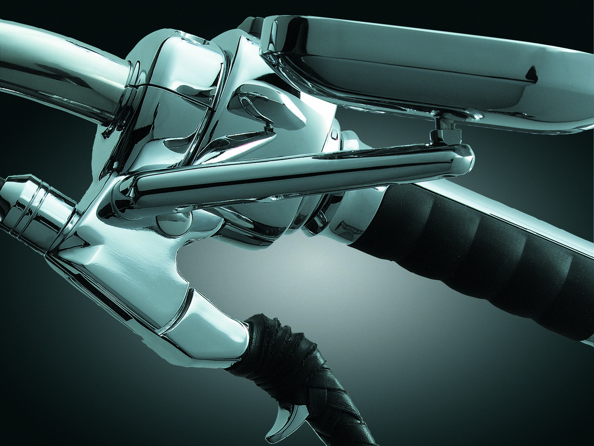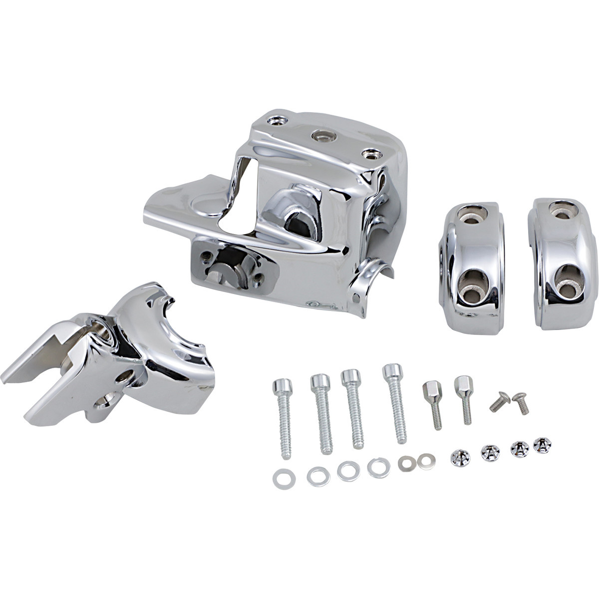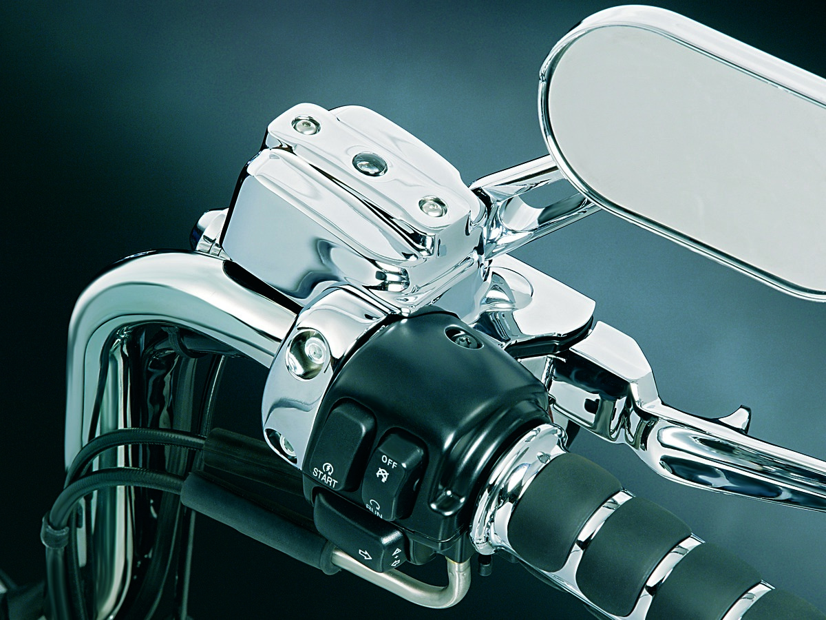 Sada krytů Kuryakyn pro zakrytí nádobky brzdové/spojkové nádobky, držáků a souvisejících částí brzd. Snadný způsob, jak zakrýt chromem poslední nevzhledné kousky na řídítkách.