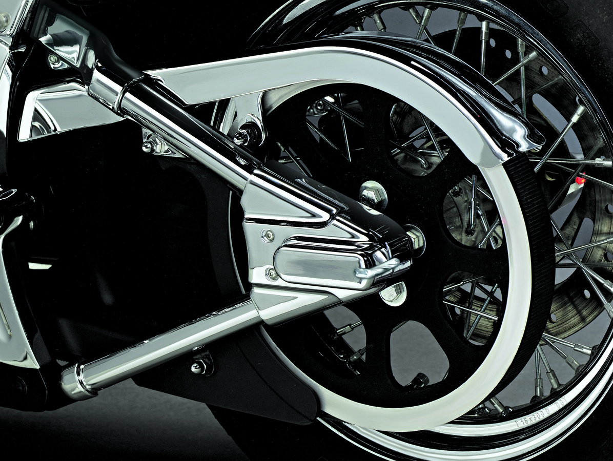 Ozdobný elegantní kryt zadní vidlice a osy, případně podle provedení dalších zadních částí motocyklů.