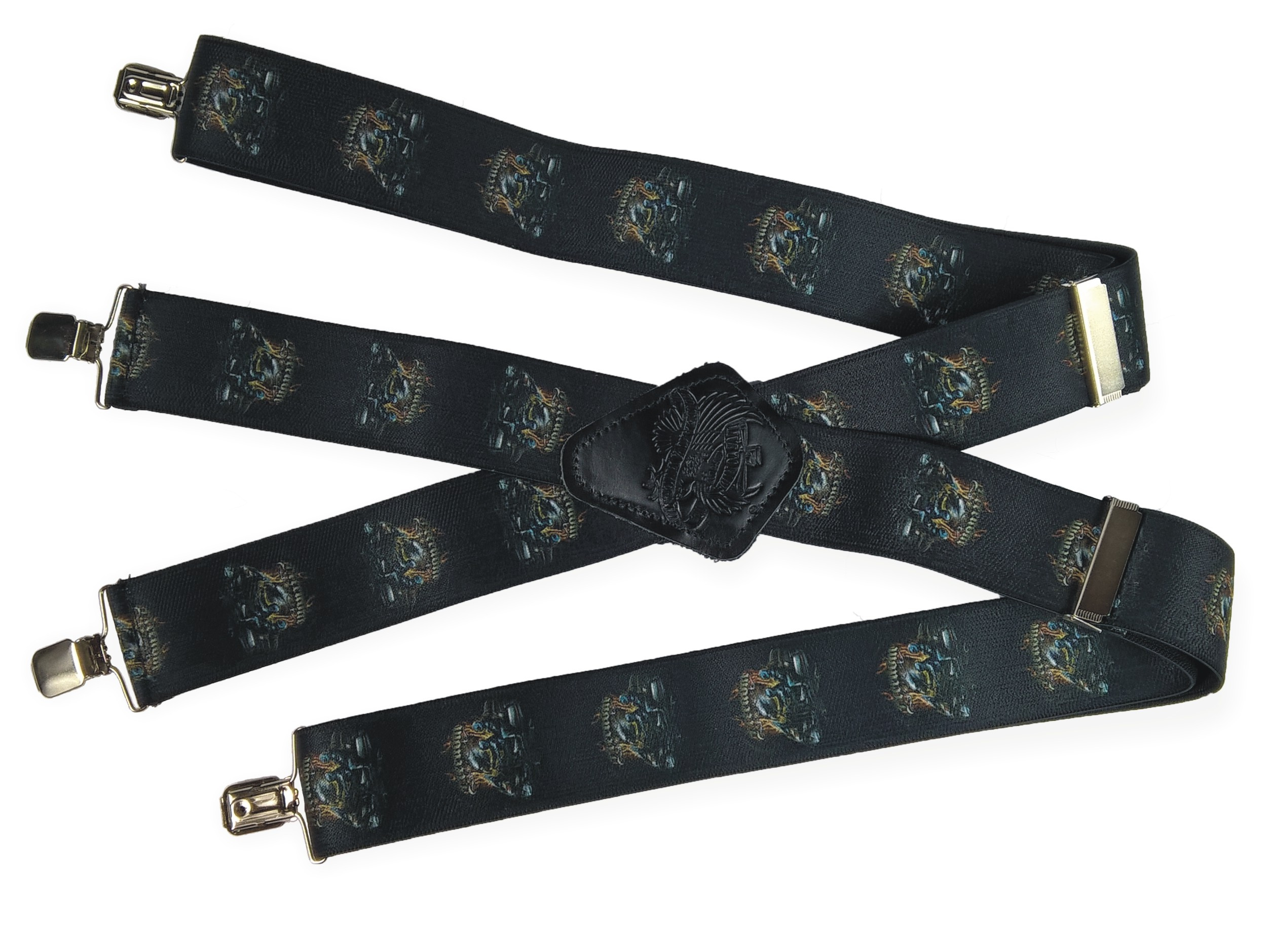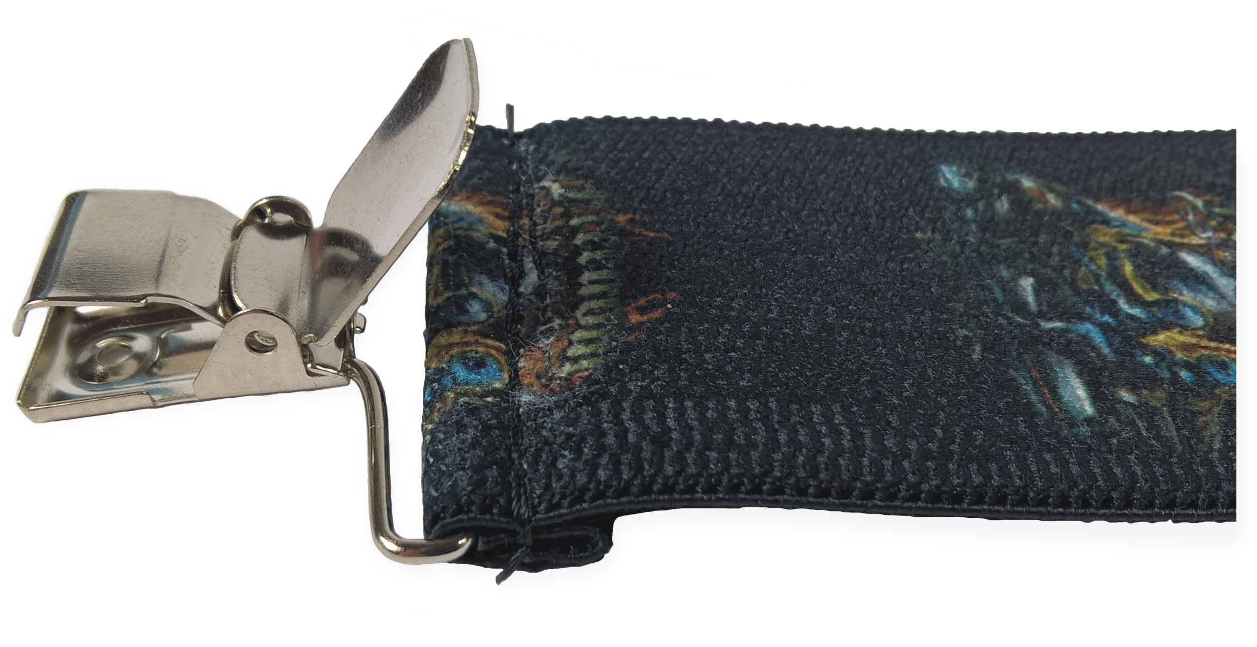 Pružné kšandy s potiskem. Libovolně nastavitelné. Připnutí ke kalhotám je tvořeno kovovými sponkami, které jsou ozubené a tudíž výborně drží a nepovolí.