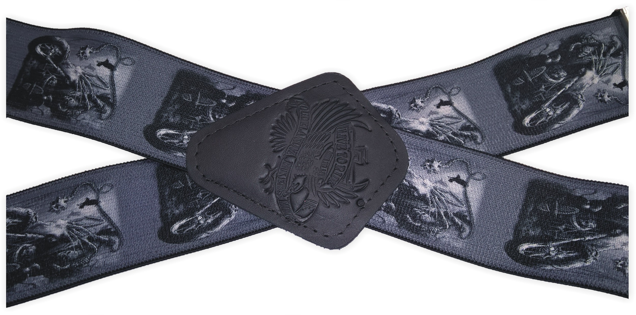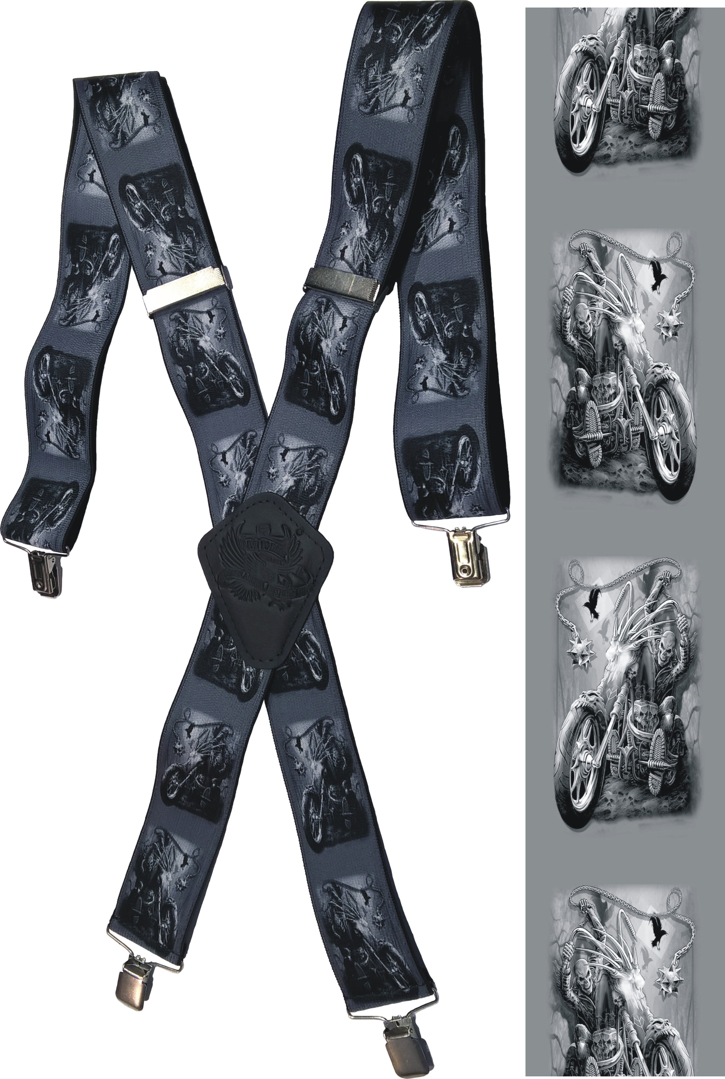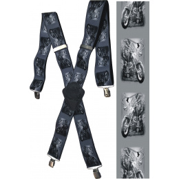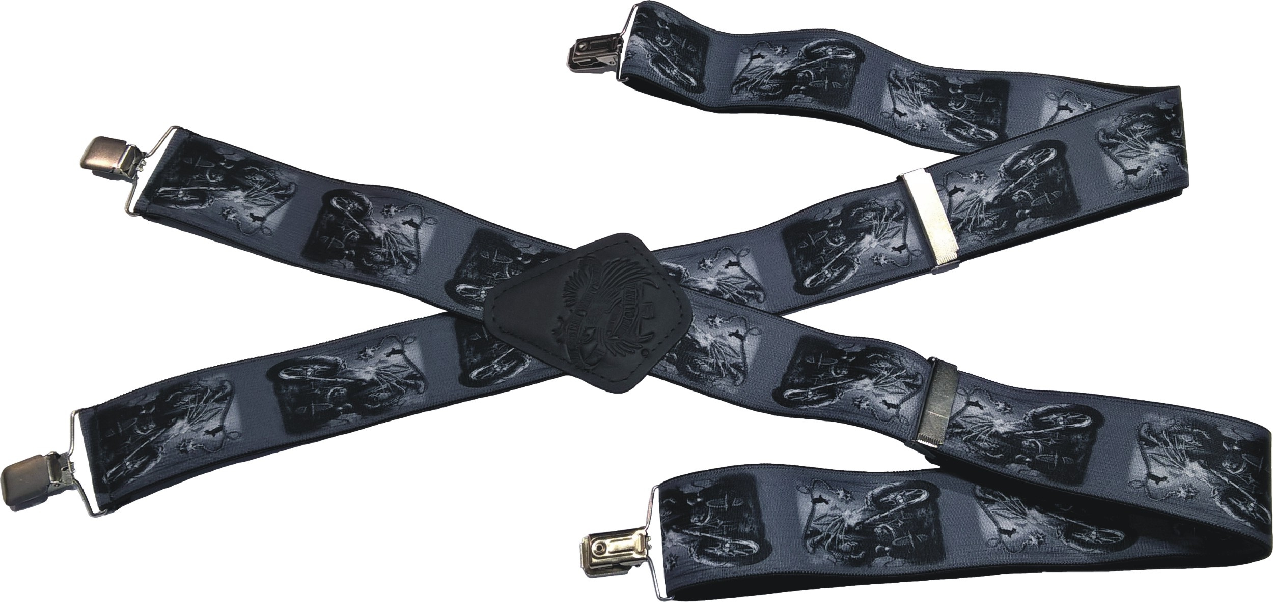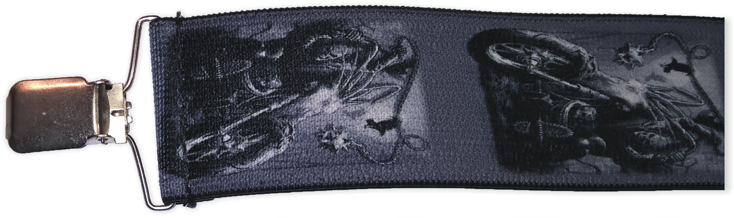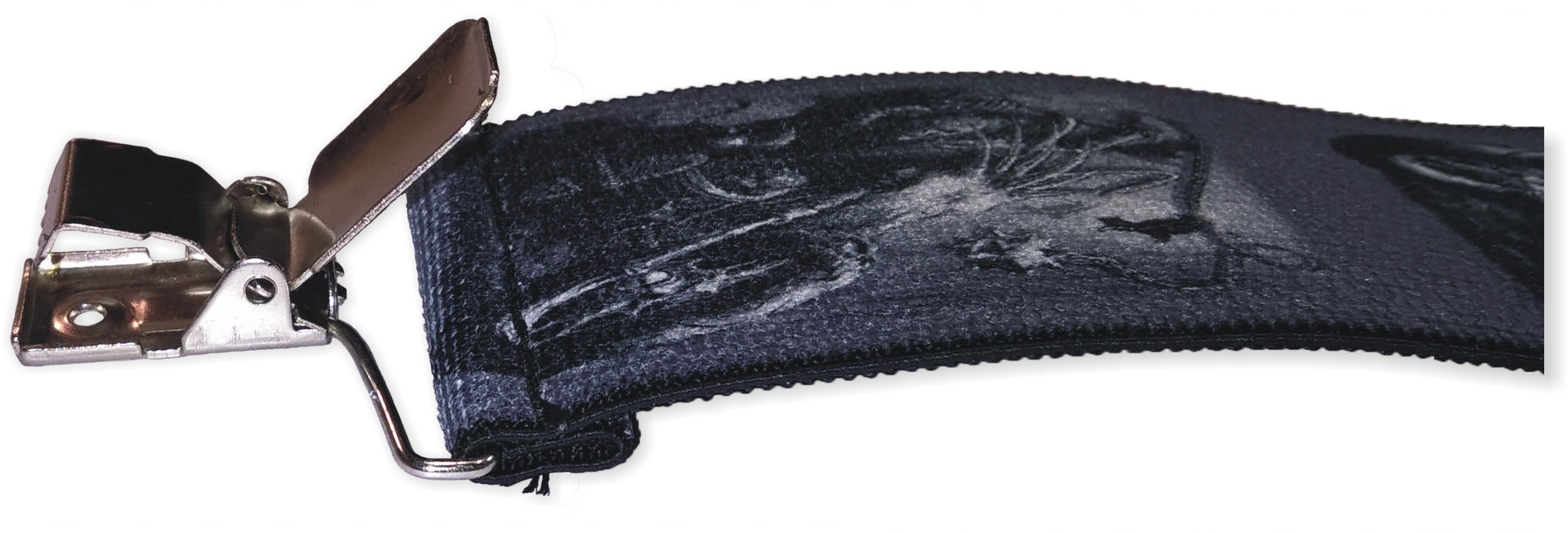 Pružné kšandy s potiskem. Libovolně nastavitelné. Připnutí ke kalhotám je tvořeno kovovými sponkami, které jsou ozubené a tudíž výborně drží a nepovolí.