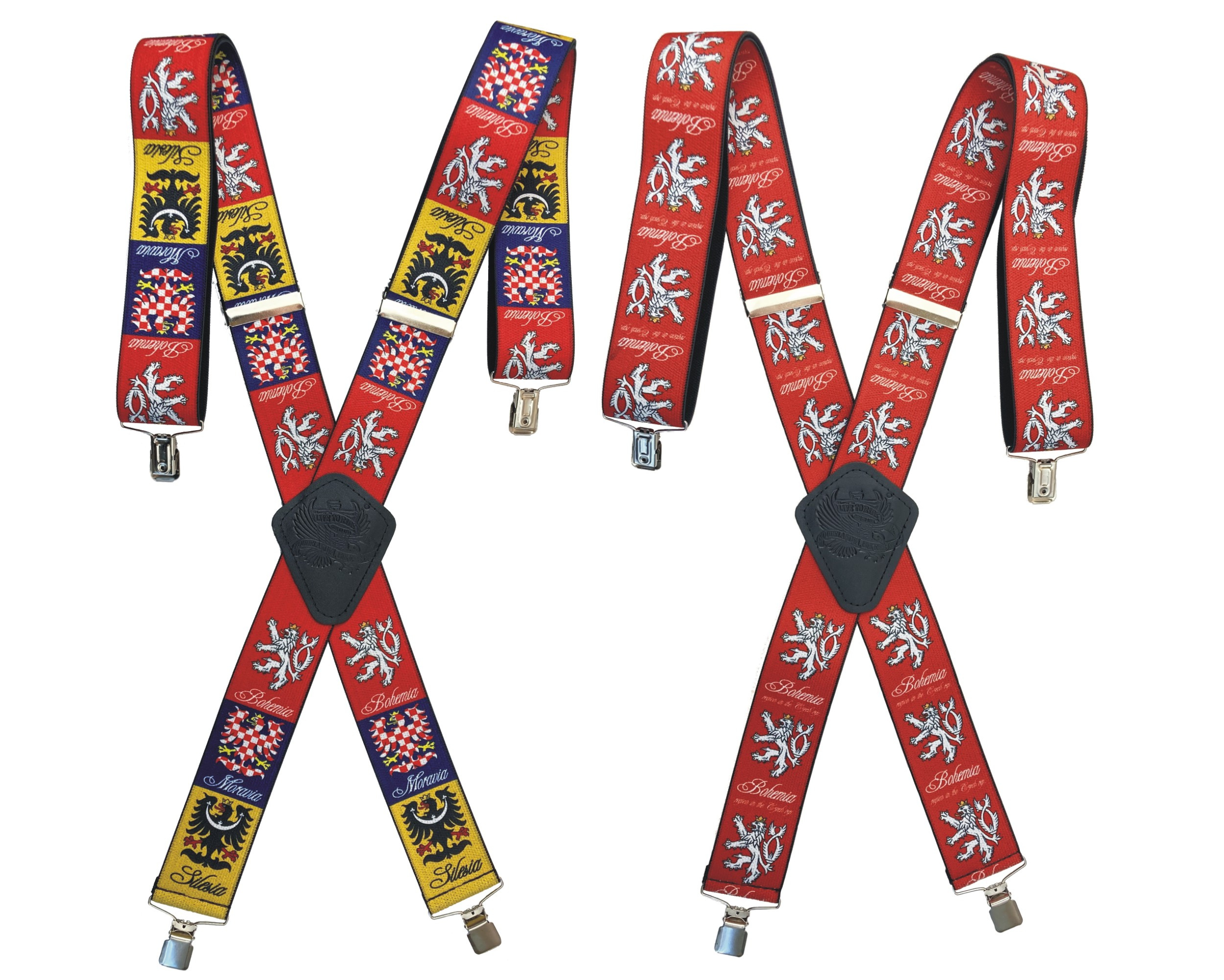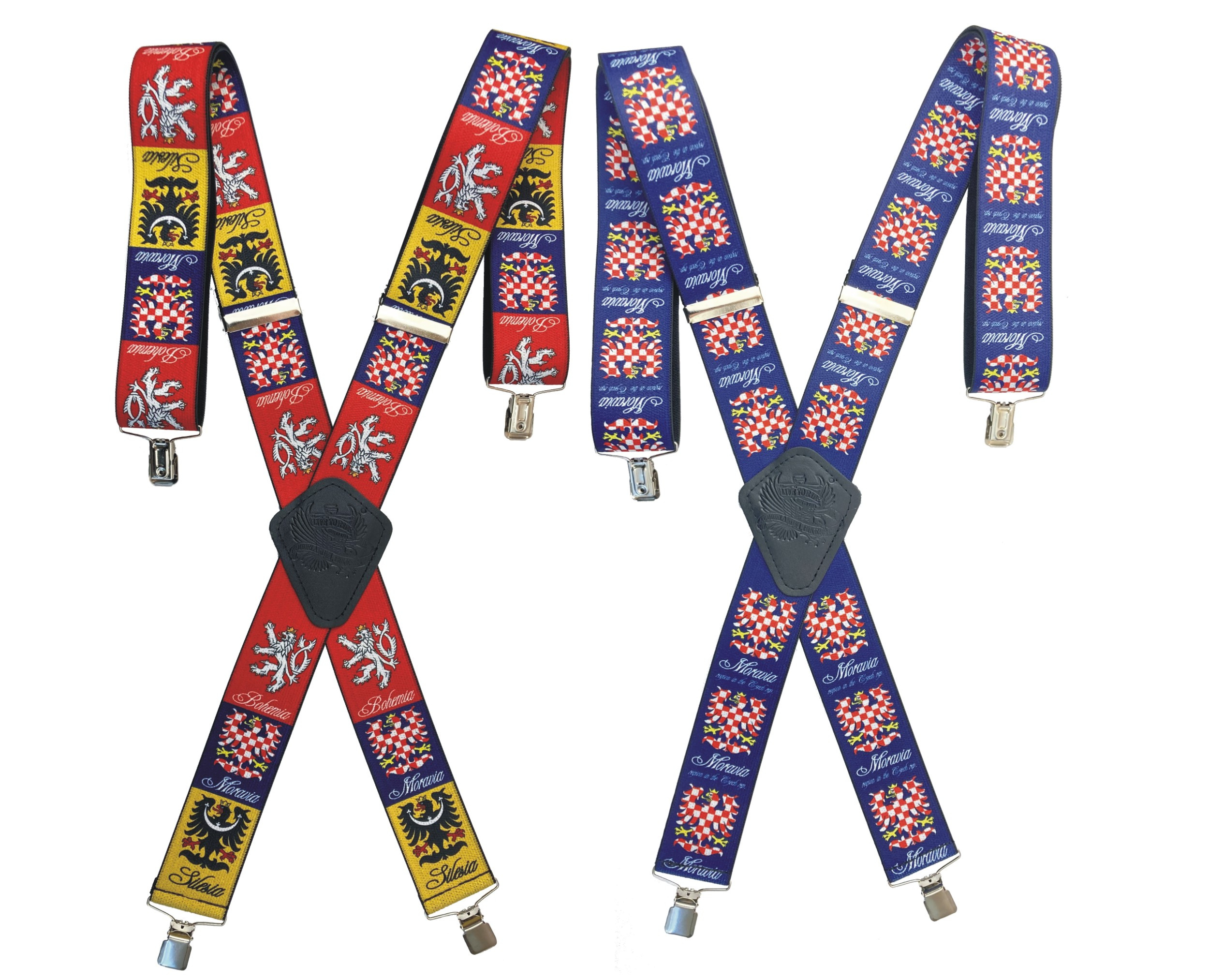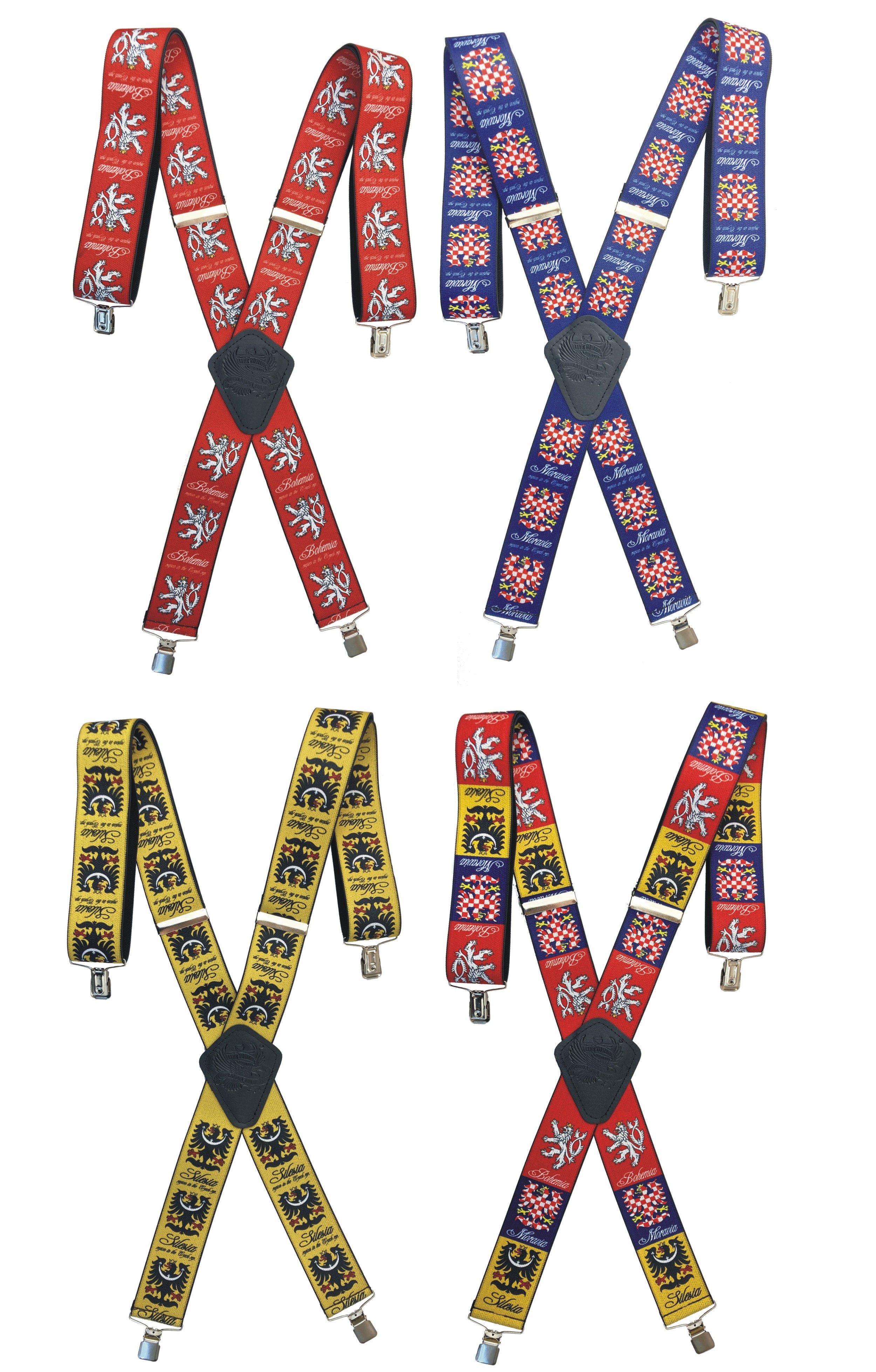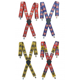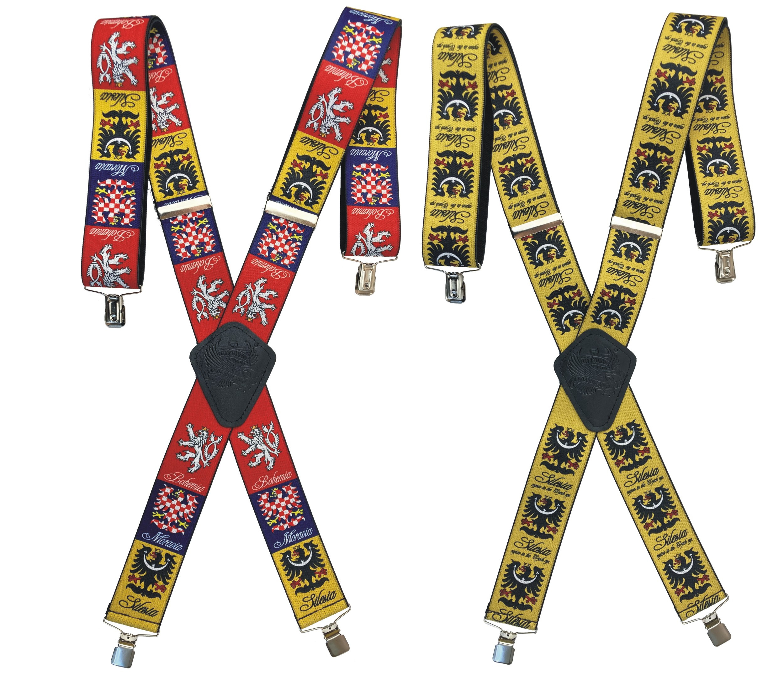 Pružné kšandy s potiskem. Libovolně nastavitelné. Připnutí ke kalhotám je tvořeno kovovými sponkami, které jsou ozubené a tudíž výborně drží a nepovolí.