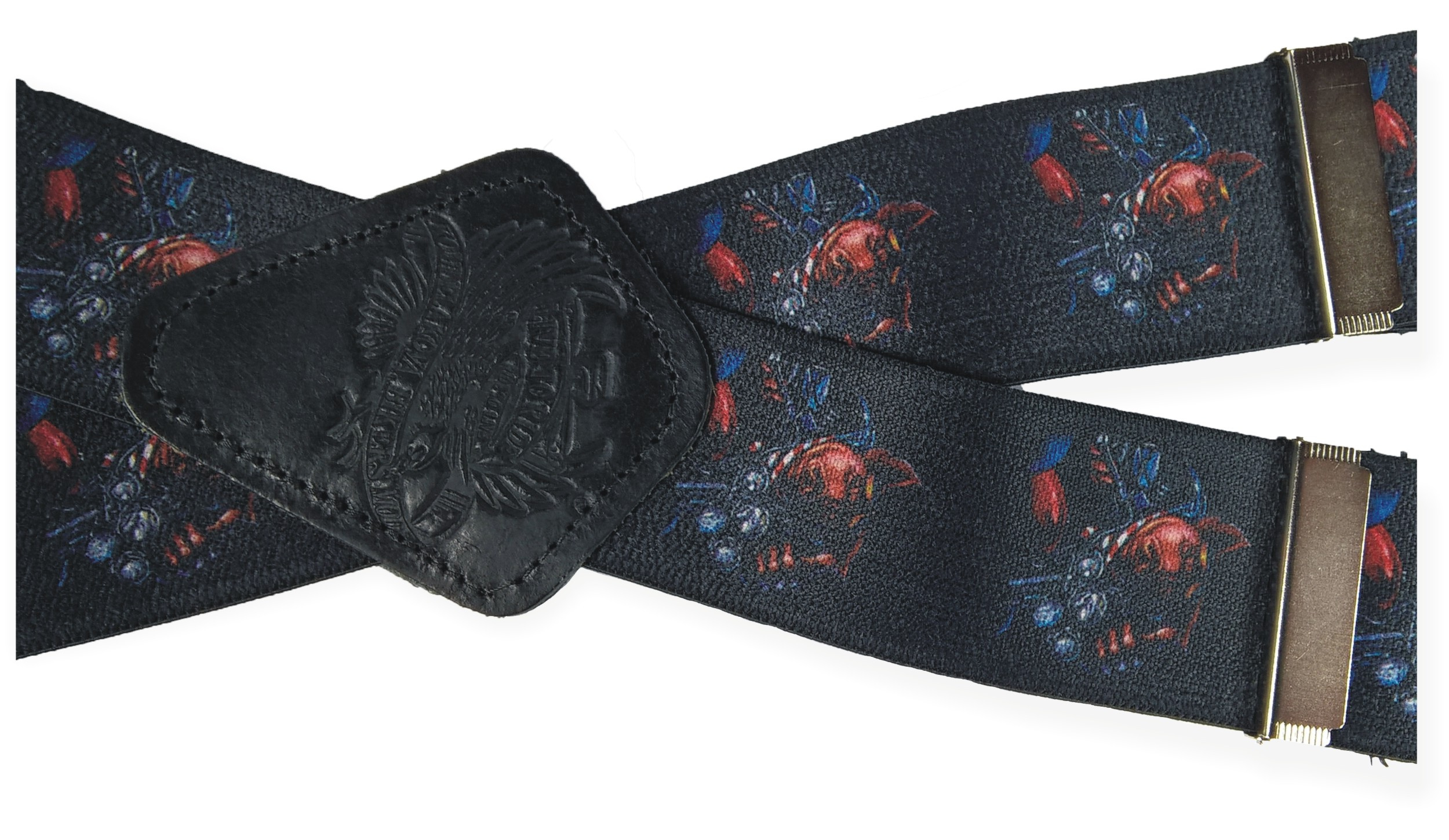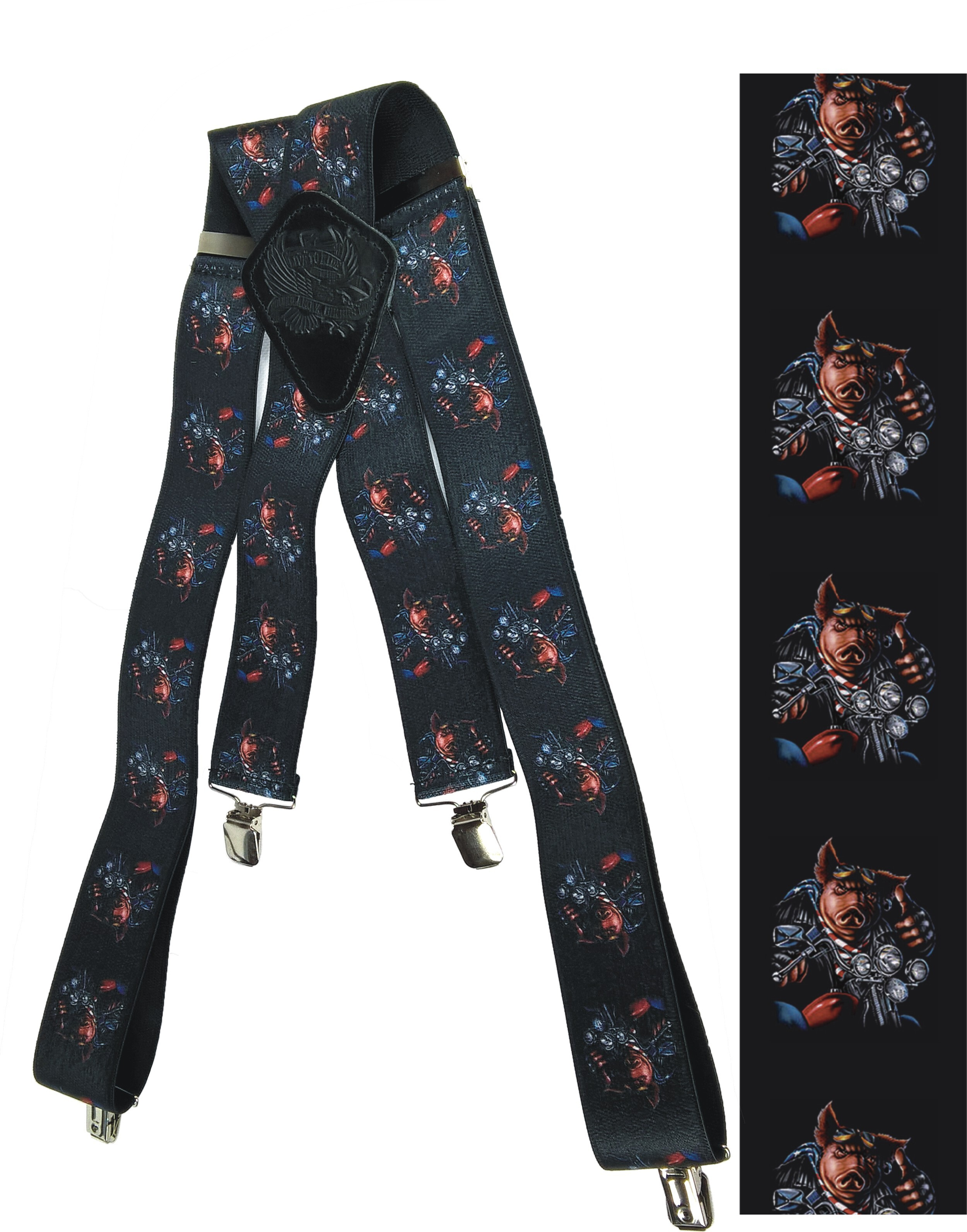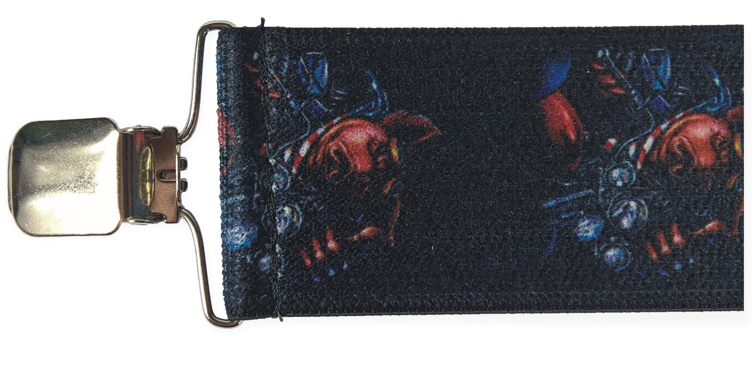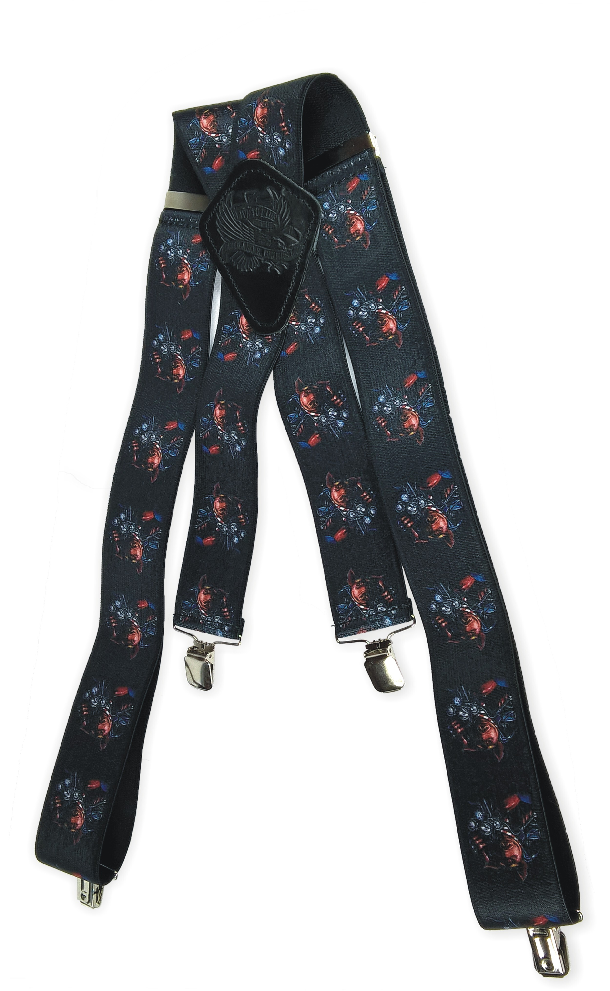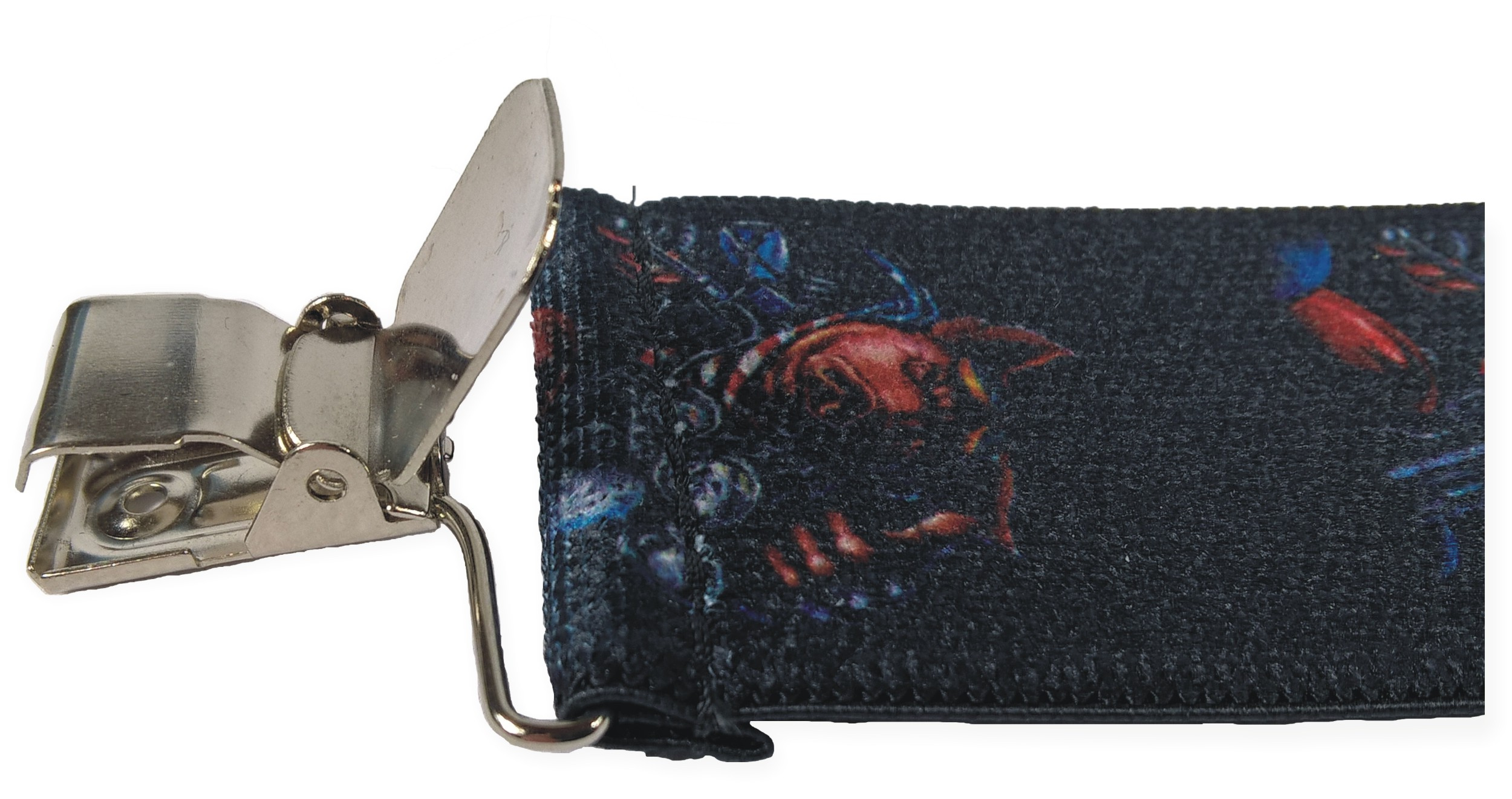 Pružné kšandy s potiskem. Libovolně nastavitelné. Připnutí ke kalhotám je tvořeno kovovými sponkami, které jsou ozubené a tudíž výborně drží a nepovolí.
