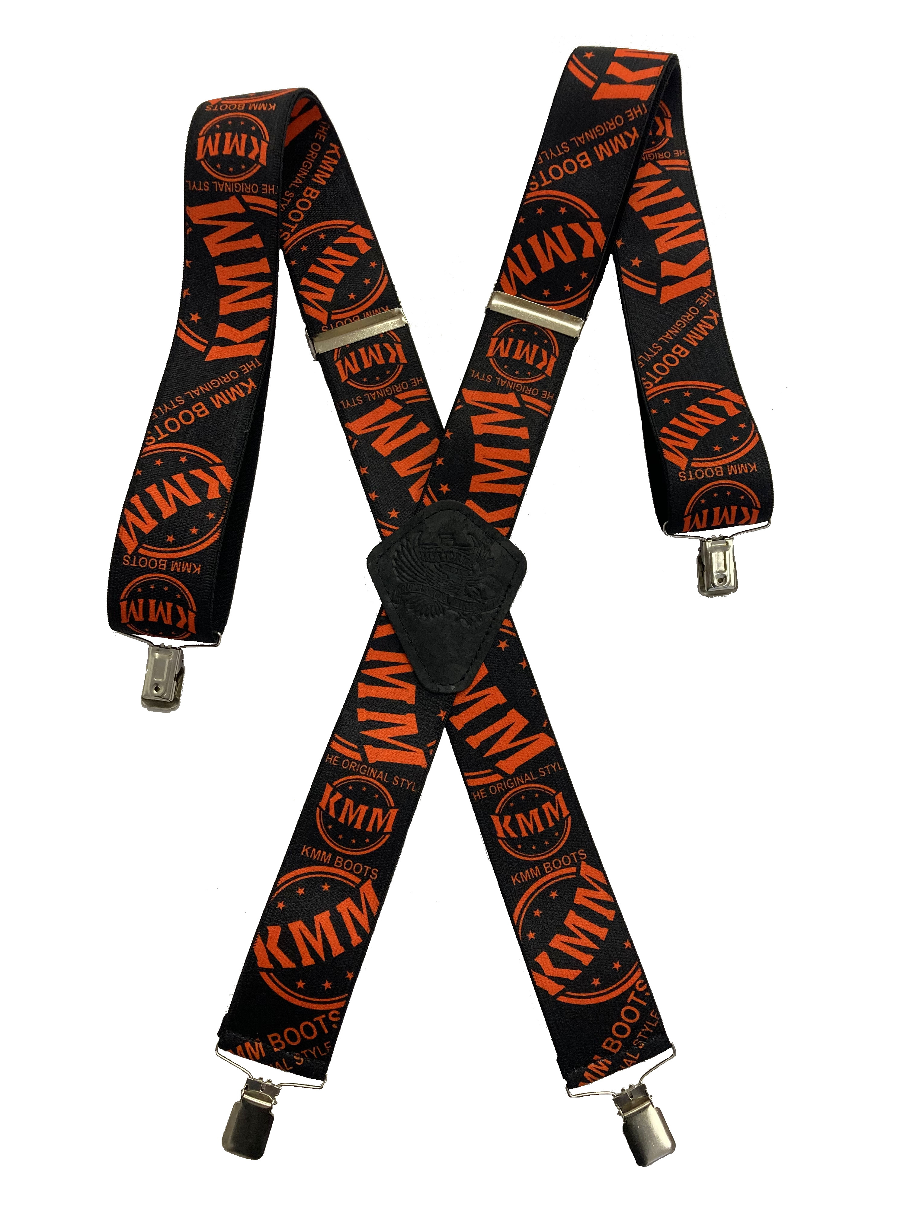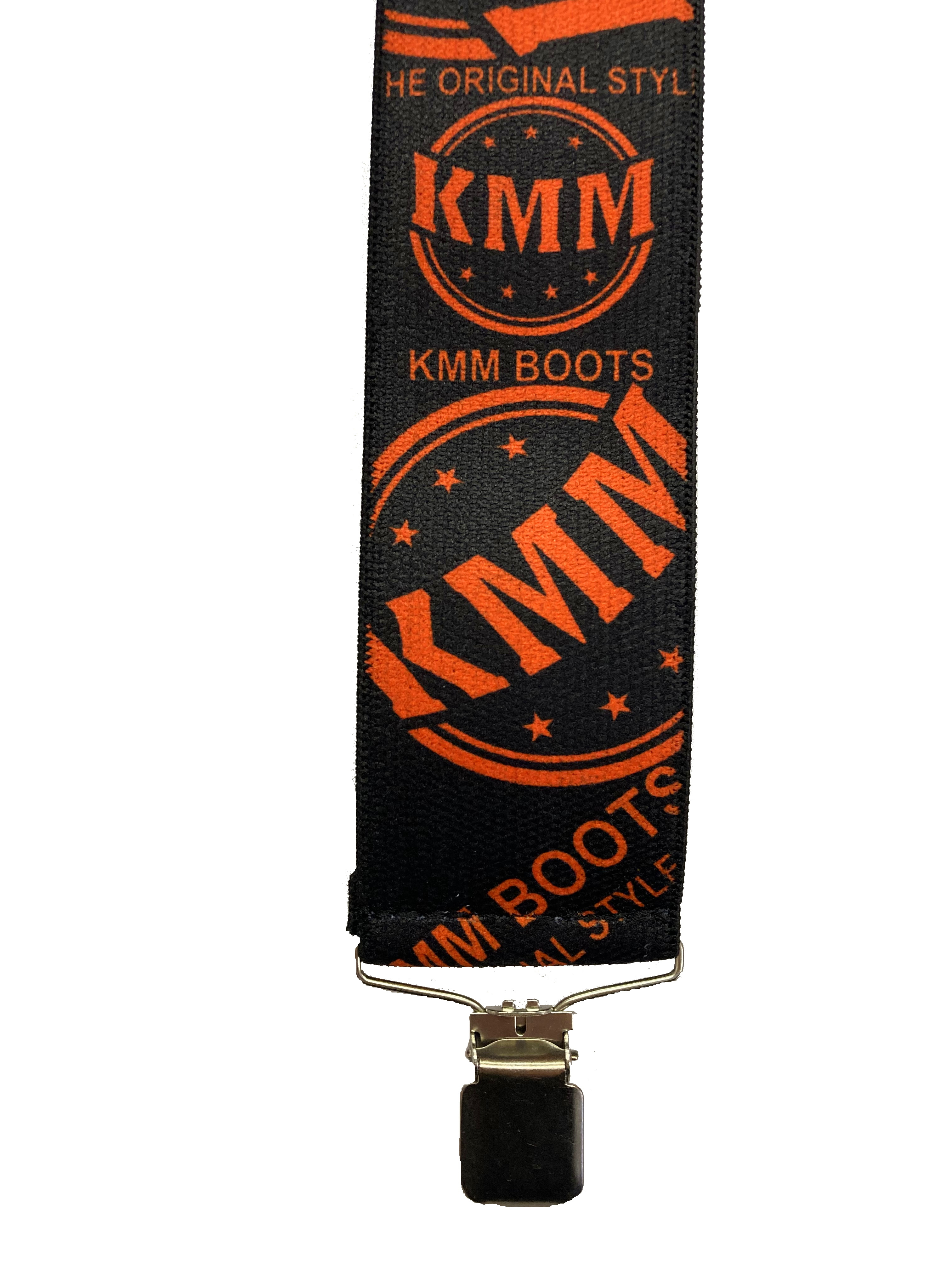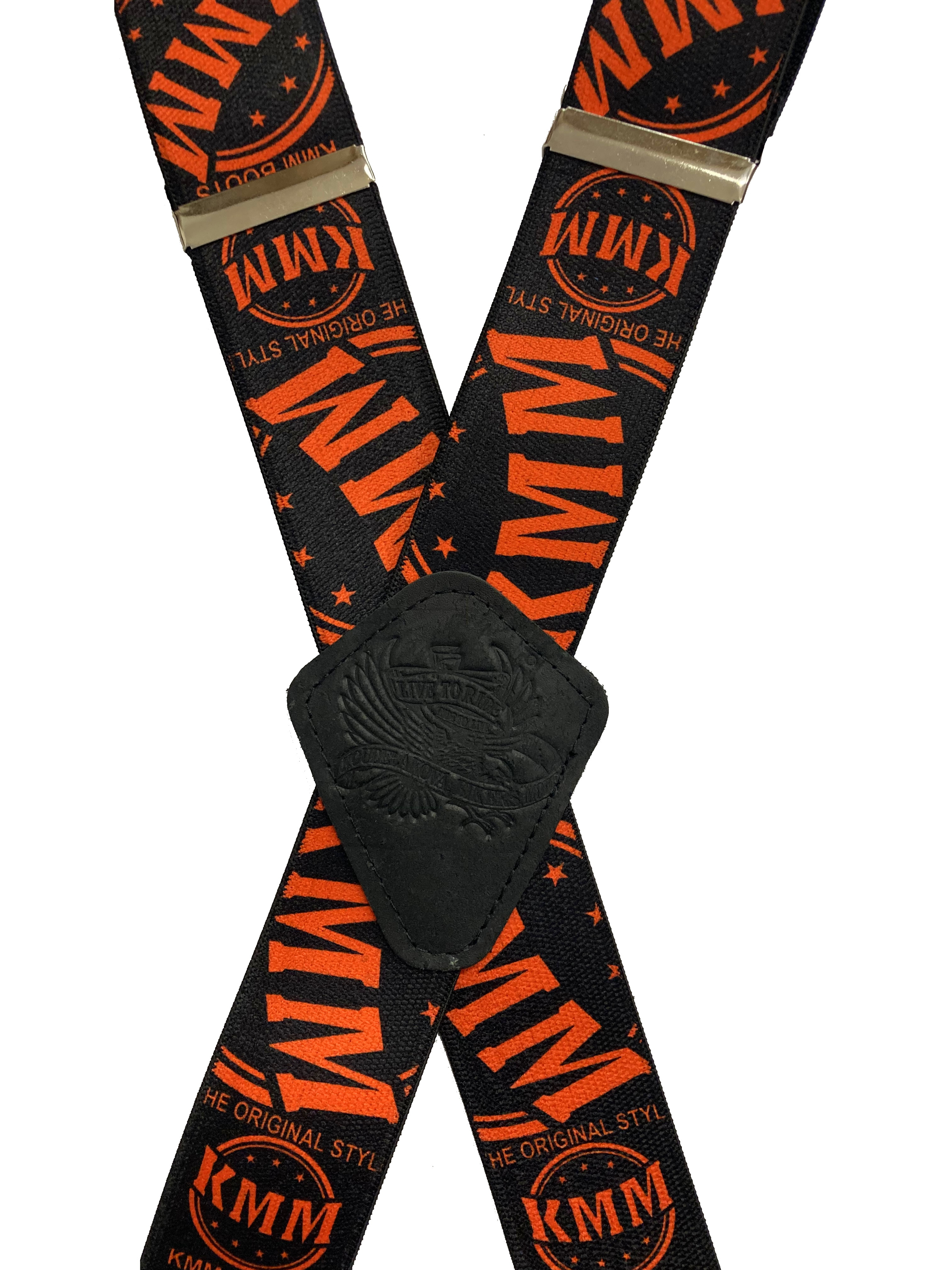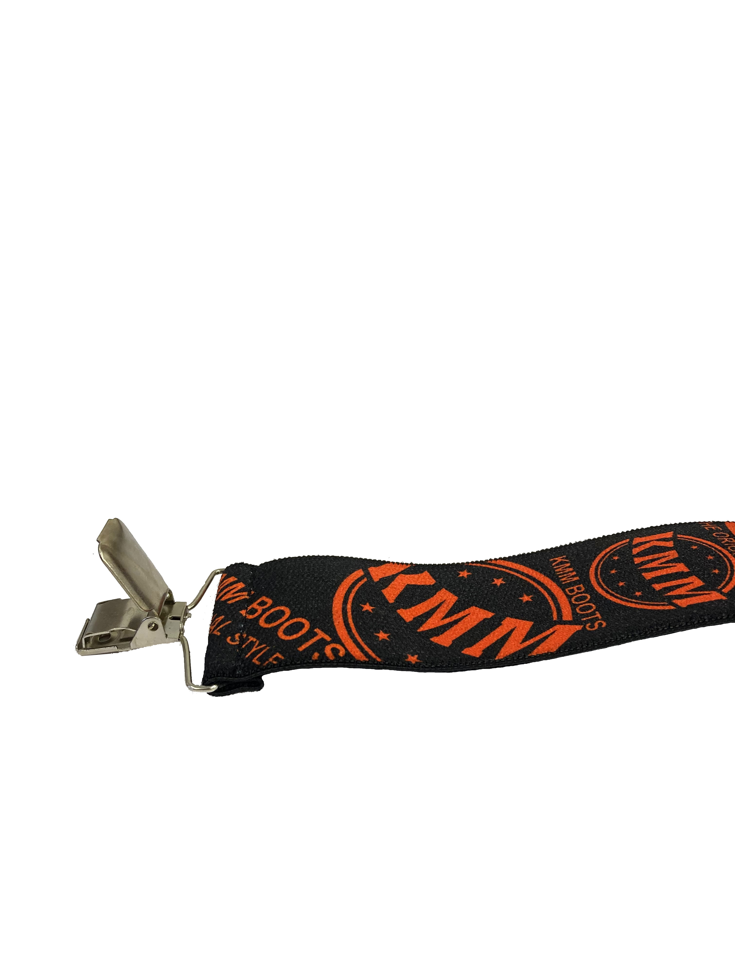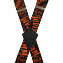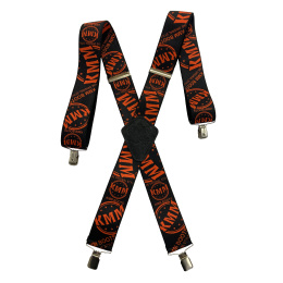 Pružné kšandy s potiskem. Libovolně nastavitelné. Připnutí ke kalhotám je tvořeno kovovými sponkami, které jsou ozubené a tudíž výborně drží a nepovolí.   Šířka: 5 cm Délka:  nastavitelná 80 - 130 cm (nenatažené) Provedení: X (vzadu 2x klipsa), Y (vzadu 1x klipsa) Materiál: PES + elastodien Barva: černá + oranžové nápisy   Vyrobeno v České republice. Lze vyrobit s libovolným potiskem či v libovolné barvě.