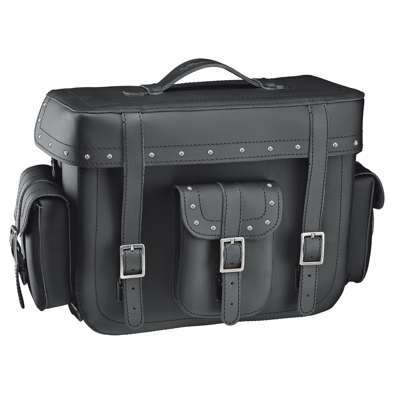 - - zavírání brašny pomocí 2 kožených pásů s kovovou přezkou