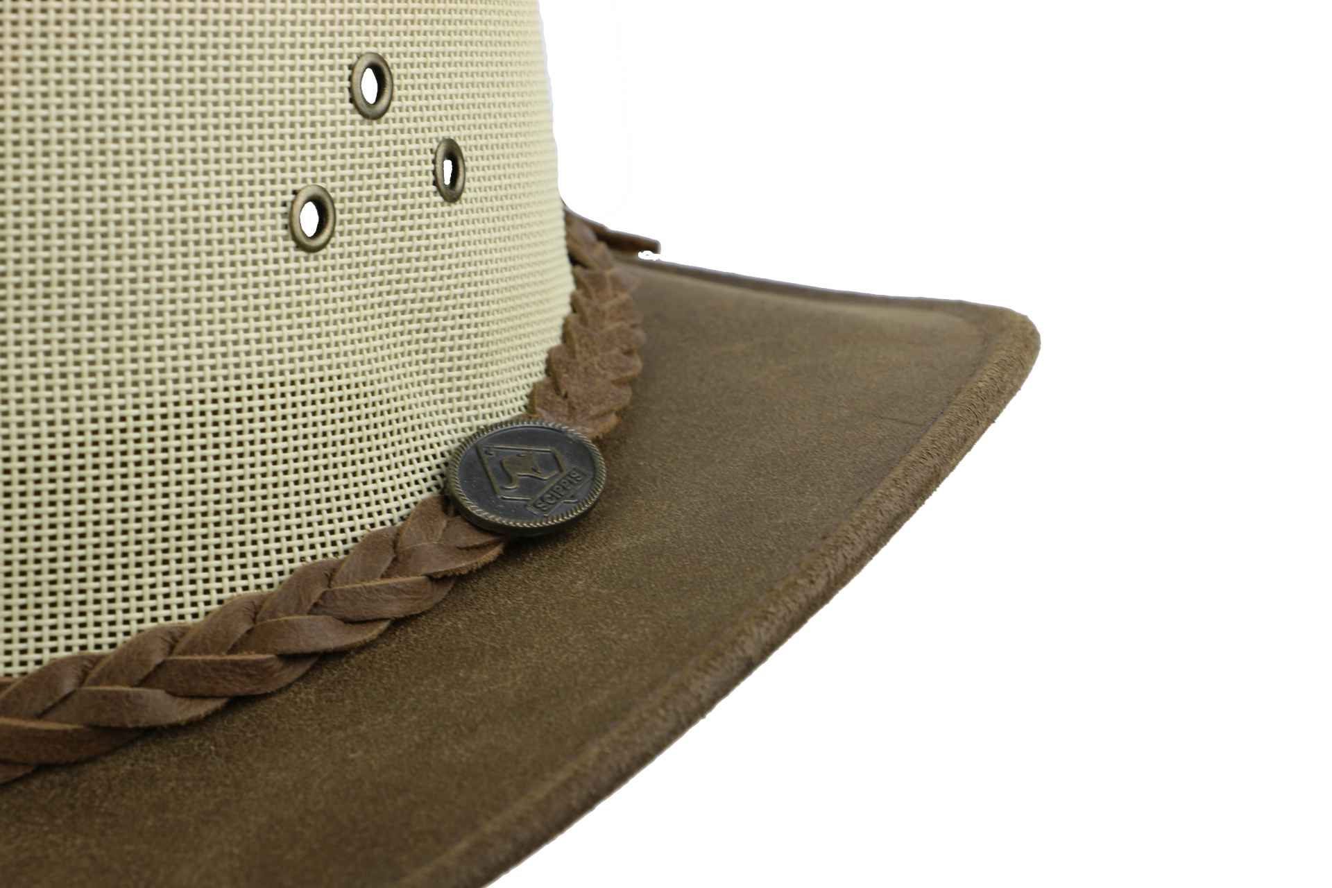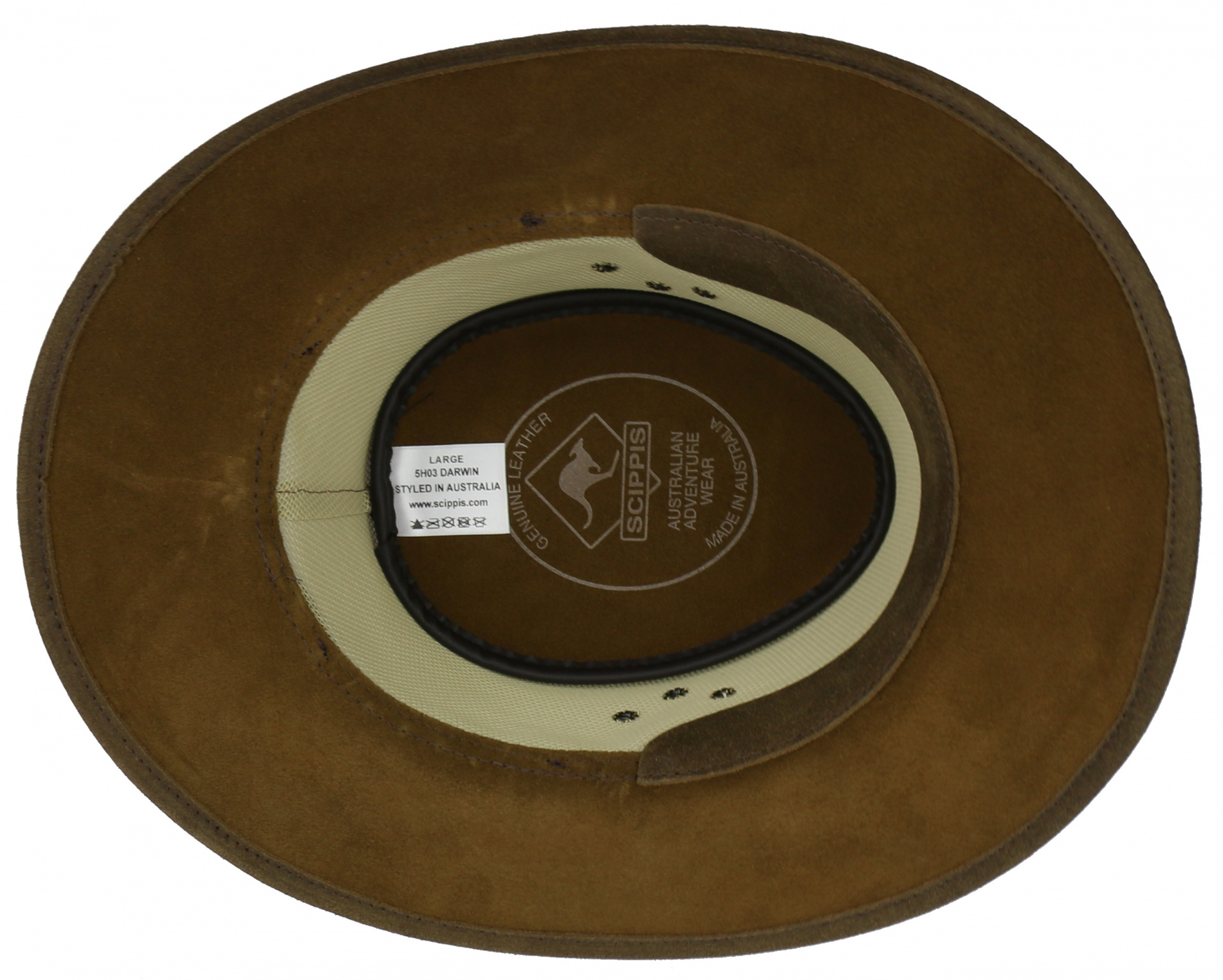 Darwin od SCIPPIS je vhodný zejména pro horké letní dny. Jeho největší předností je dýnko ze síťky, což zaručuje dokonalé odvětrávání. Je vyroben z hovězí kůže, ozdoben pleteným páskem z pravé kůže a kovovým logem SCIPPIS. Uvnitř klobouku jsou malé otvory, které umožňují snadnou montáž řemínku pod bradu.