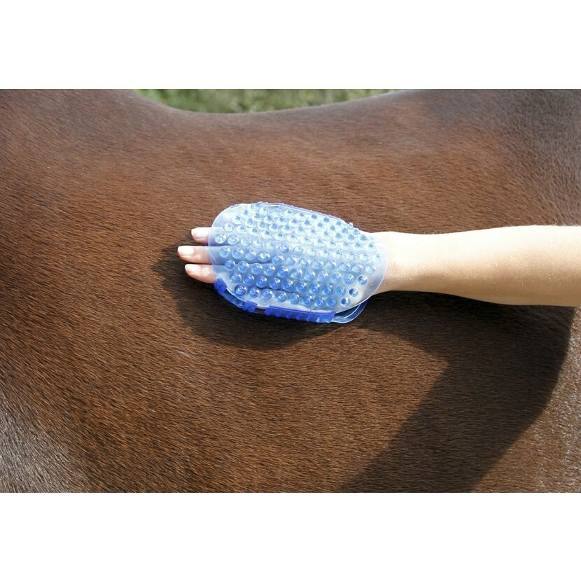 Jemné gelové magnetické masážní hřbílko pro uvolňující masáž koně. Oboustranně použitelné se sedmi magnetickými masážními kuličkami a pryžovými nopky.