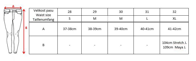 poté vyberte vhodnou velikost kalhot na motorku pro Vaší postavu podle naší tabulky: