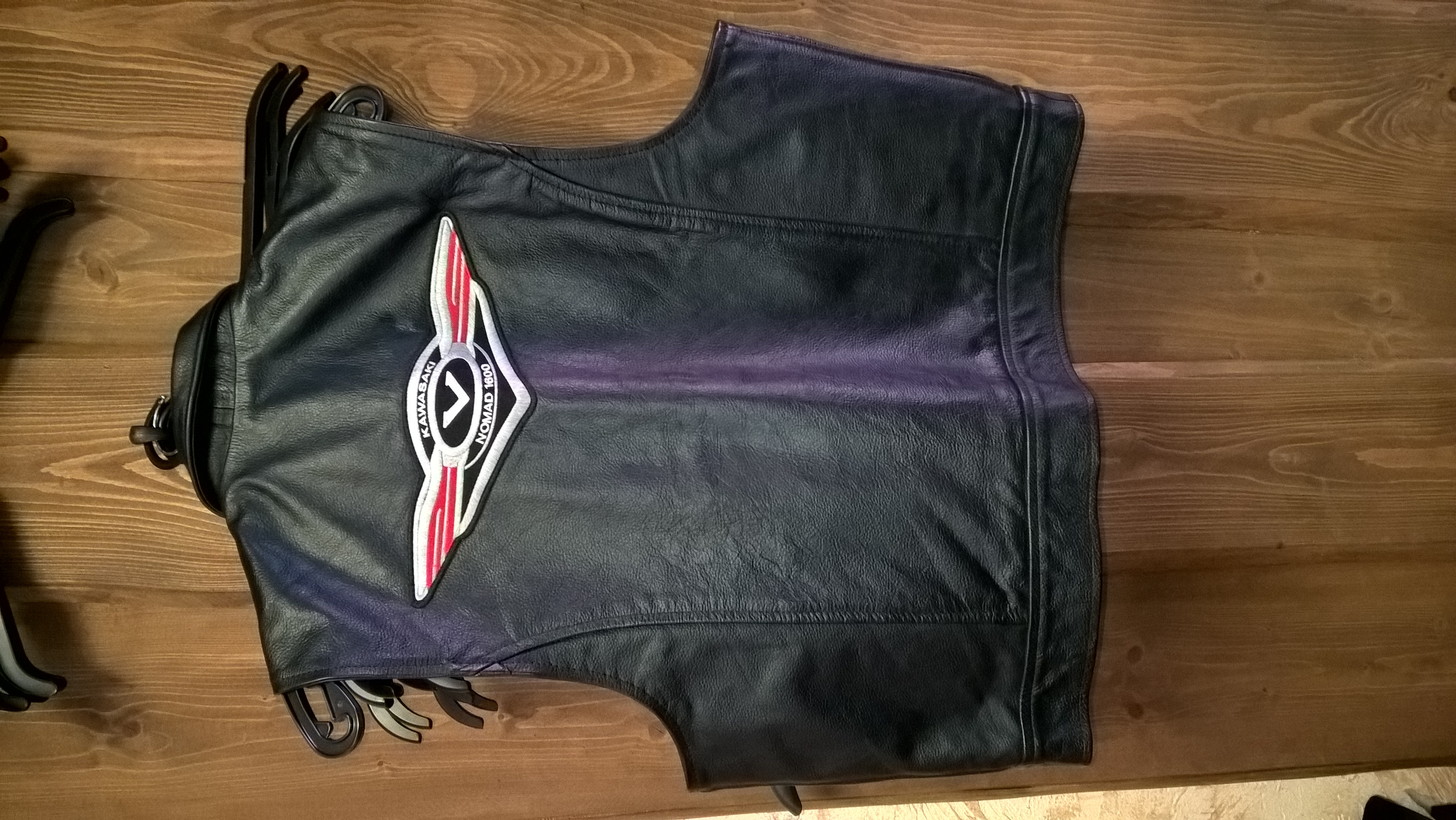 Kožená vesta s nášivkami Kawasaki.