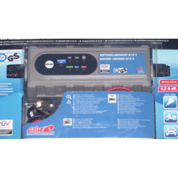 Nabíječka 6/12V DC pro gelevé i elektrolytové baterie do 4,2 A. Inteligentní nabíjení, po plném nabití baterie se automaticky odpojí, možno použít jako udržovací zdroj, např, u motocyklů přes zimu.