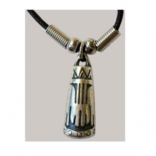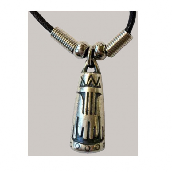 Kovový přívěsek na černé šňůrce imitující kůži. Zapínání karabinkou.