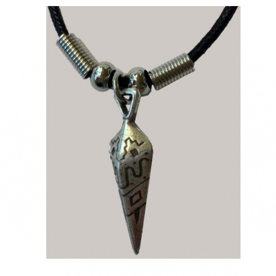 Kovový přívěsek na černé šňůrce imitující kůži. Zapínání karabinkou.