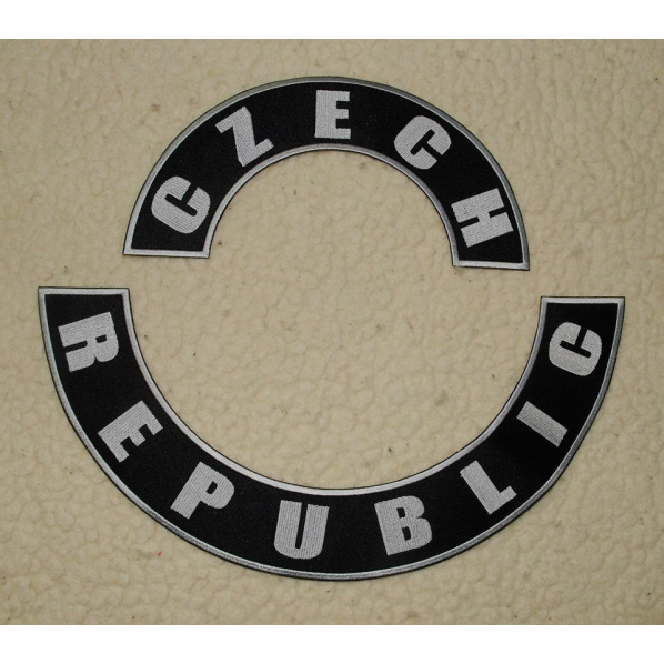Popis produktu nášivka nápis Czech republic dvojitýNášivka vhodná na moto oblečení (kožená vesta, kožená bunda), vlajku aj., možno nažehlit. Rozměr: horní (Czech) cca 248x120 mm spodní (republic) cca 358x173 mm