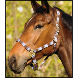 Popis produktu nastavitelná nylonová ohlávka s kostkovaným vzoremStájovka ze zdvojeného polypropylenu. Nánosník a nátylník je možno nastavovat. Kování ve žluté barvě.